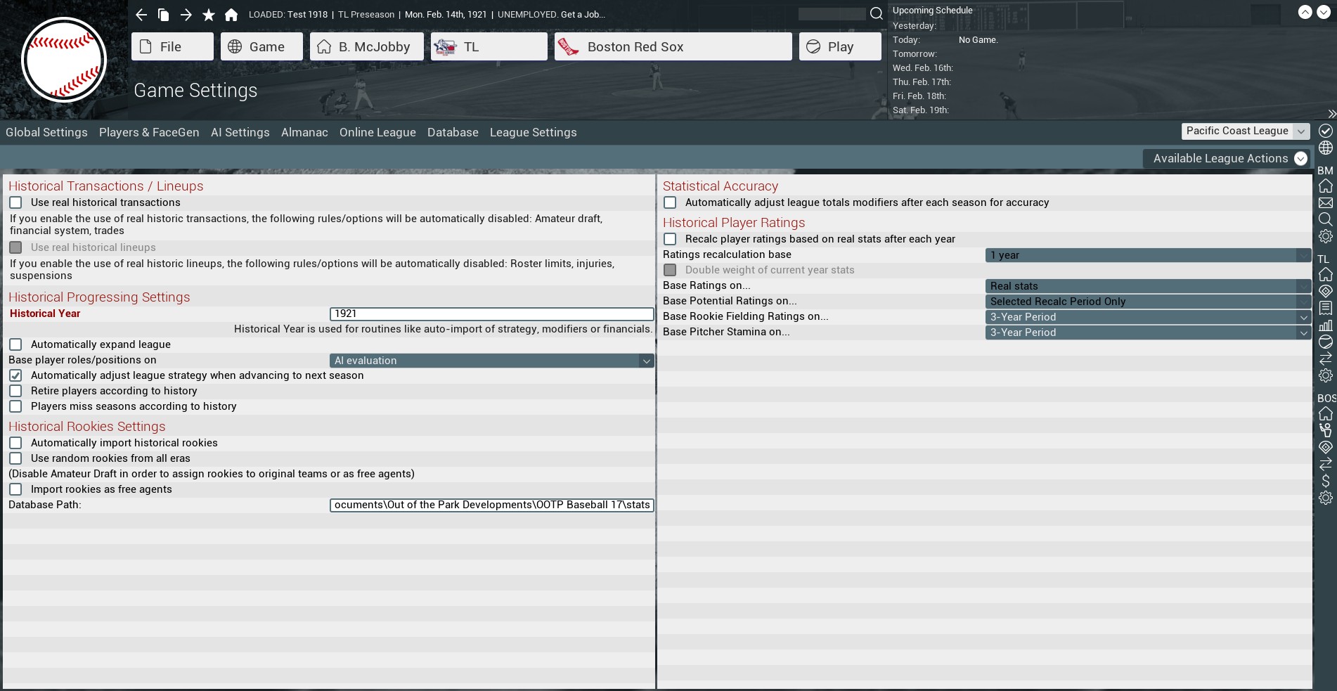 Now, a follow up question for you, Sir Spritze. In the game, I have recalc (3-year FWIW) selected at the major league level. When I look at the league settings for the minor leagues, recalc is not selected automatically. Should I select it there, as well, to have consistent results? What is the effect of selecting or not selecting recalc at the minor league level in historical games? Thanks. (Oh, and by the way, you can only get to the "Historical" settings screen in the minors by being there in the majors, and then changing the league in the drop-down menu on the upper right-hand side. If you go directly into the minor league, no "Historical" tab appears in league settings. That's weird, huh?) |