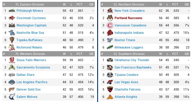 The Critters expected record at the break is their actual record. The Crusaders are two games over their expected record, but that still doesn’t change the standings. The only meaningful difference in expected record is over in the FL East, where the Capitals are +5 and would be fourth in the division behind the Rebels and Buffaloes that way.