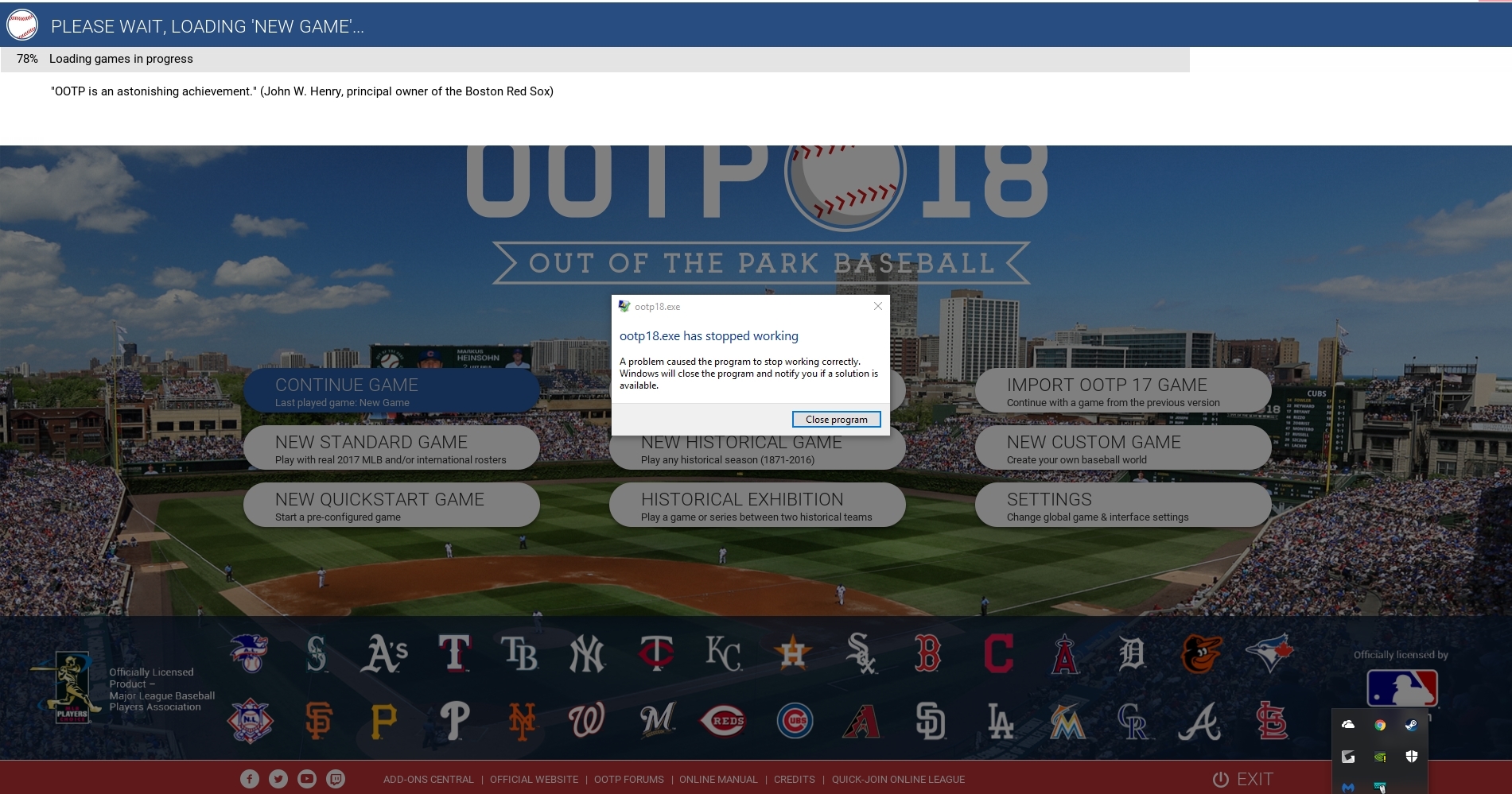 Here is a screen shot. It hangs 78% of the way through "Loading Games in Progress." Another league did the same thing, but I thought it was because I had a power failure while playing and it was corrupted. It's always 78% through "Loading Games in Progress."