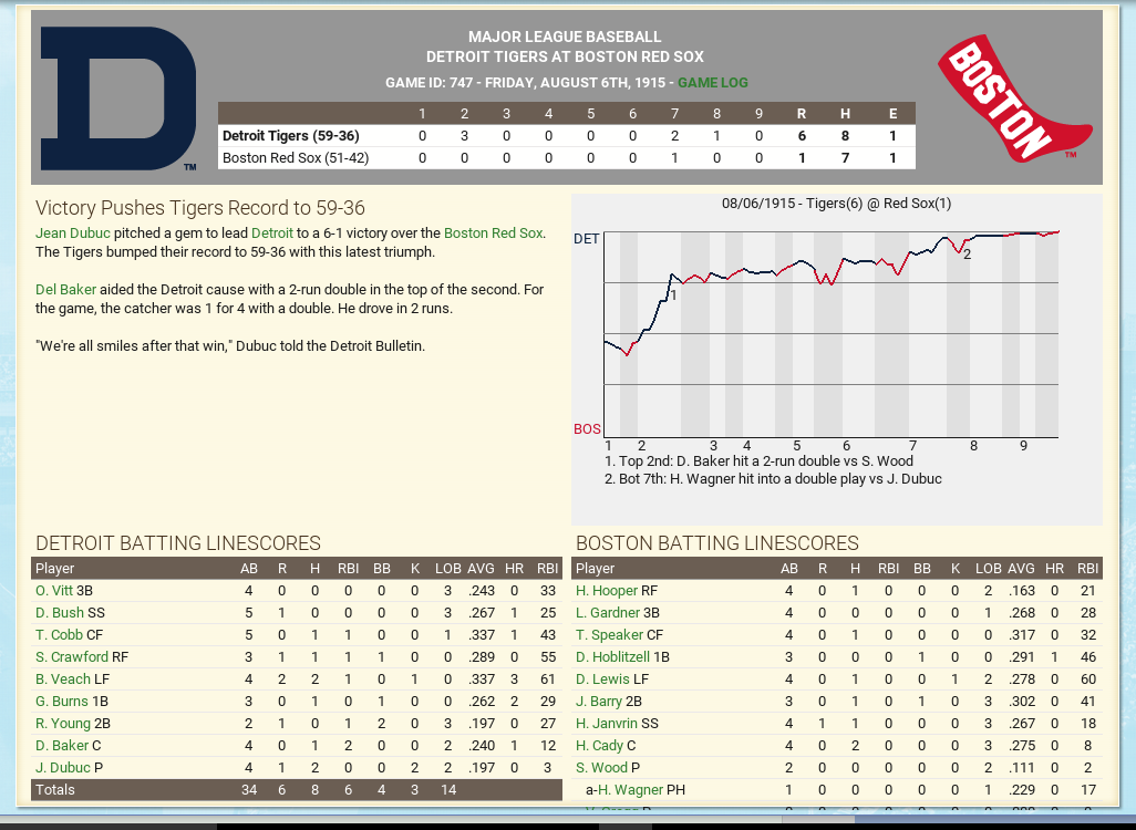 I think this is the 2nd time this happened...I have two Aug. 6 games posted one with the Red Sox winning and one with Det winning. In game it shows Det win. And, Aug. 7 game that Det (vs A's...a win) is not showing in game. So, 2 games appear to have been wiped out. I probably backed up files but at the same time I'm not getting this sequence.