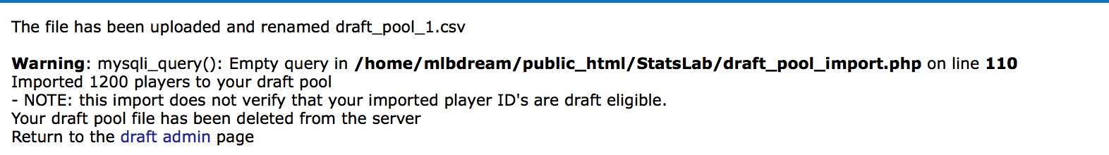When I import the draft pool, I get a message that it uploaded 1200 players. When I then Generate Auto Draft List, it only adds 531 players and I have this message. I get a similar message with uploading the draft order and the draft eligible players. The 3 screen images of the messages are included below.
