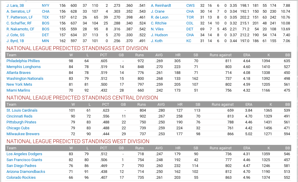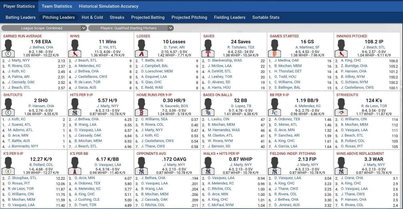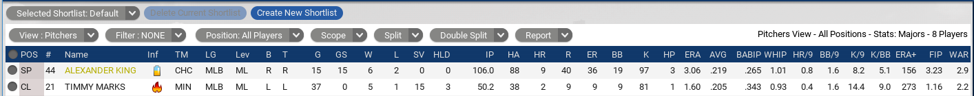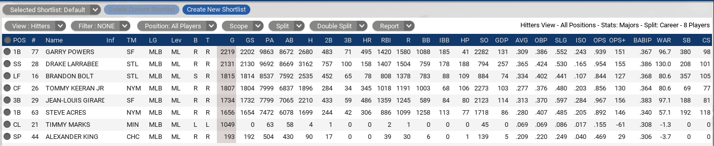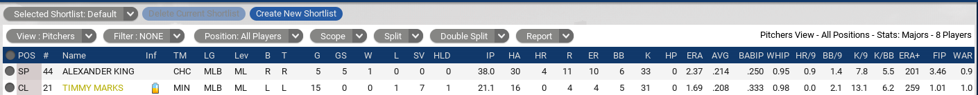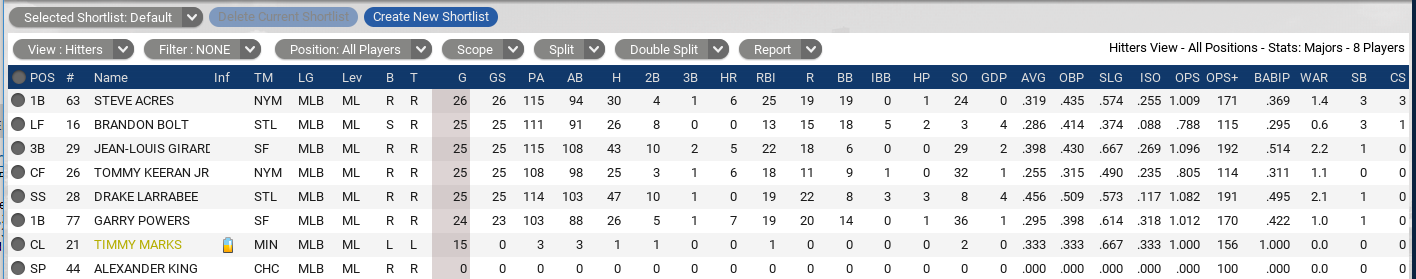 Powers only got one, so I will go day by day watching to see if he gets another, otherwise, he signs with SFG again. Girard: ATL 6@29.18 175.1 PIT 6@24.0 144.0 SFG 6@30.1 180.9 STL 6@25.1 151.0 Powers: SFG 2@19.4 38.8 |