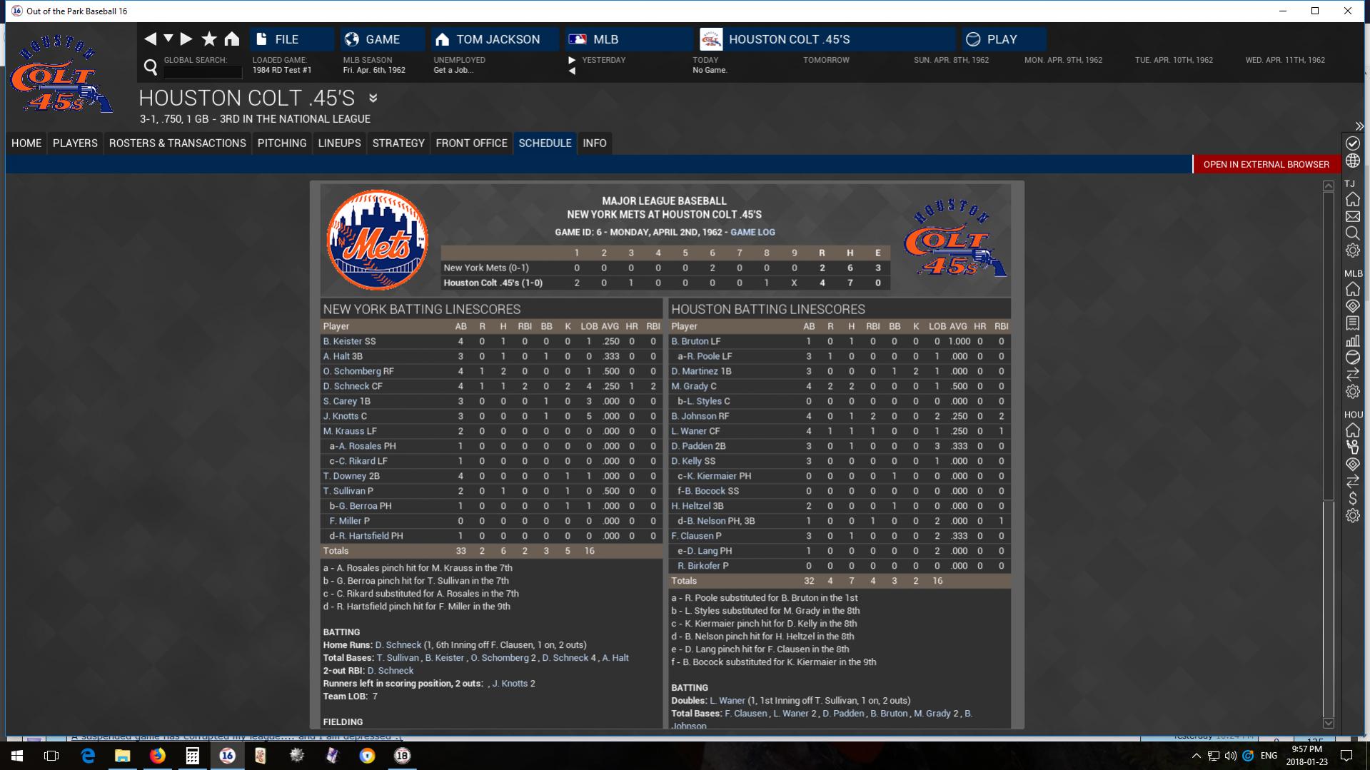Here's the two-part boxscore for the first ever game for both the Colt .45's and the Mets, and the first ever win for the Colt .45's: