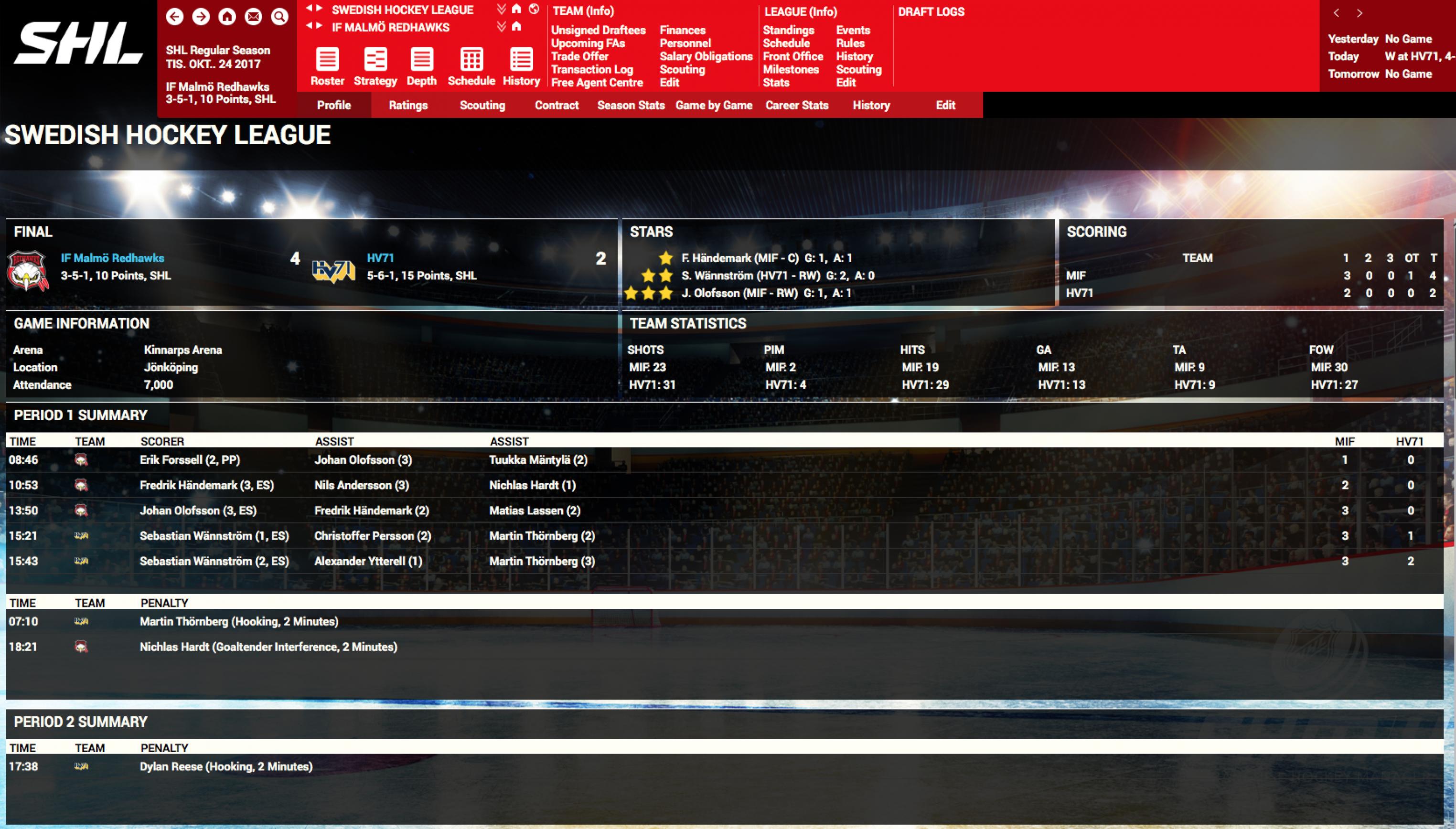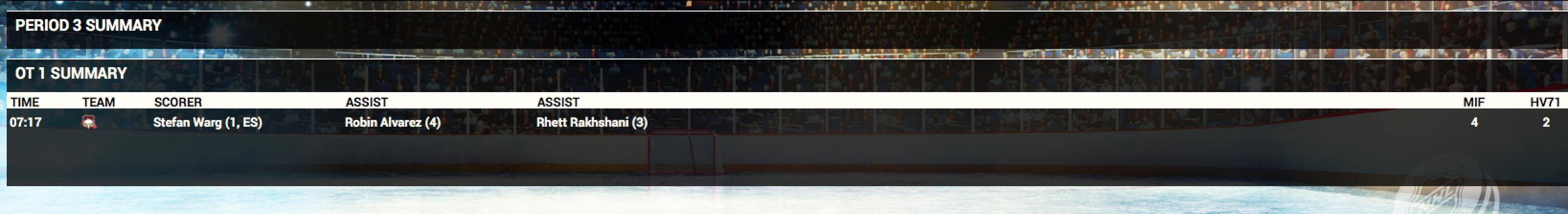 Almost looks like an OT to resolve a 2-game total goals series, but that makes no sense for an SHL game in October. Can you show me the stats screens for both teams? I'm wondering if a goal was recorded there but somehow skipped in the summary.