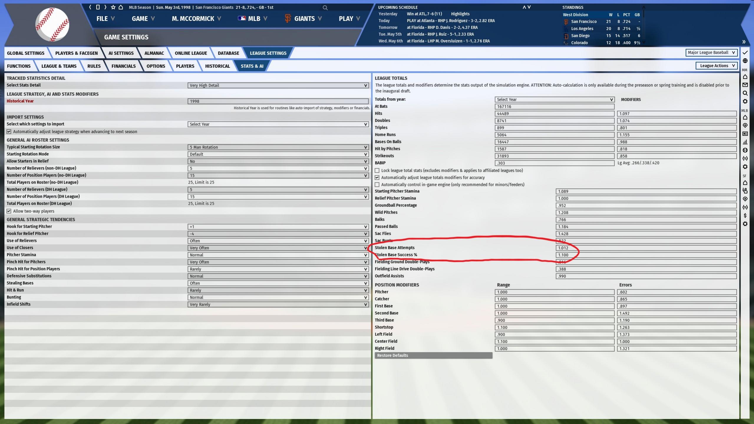 you may need to increase # of steals as opposed to %success LTM for SB. i can get ricky henderson-esque results for the players with >max speed/stealing ability and at ~75-80% or higher rates for those elite players. it's simply about LTM/LTs used. you want higher percentage, it may take a historicall inaccurate League-wide Total (use modifier, don't change totals, only speaking of results as a 'total'). unfortunately, i cna't just give you me LTM/LT for stealing/stealing success. you'll have to trial and error to get what you want. (i doubt our choices on other settings would have the same results and i don't play challenge mode) ootp has to make some decisions that will make some feel something is unrealistic while maintaining realism of some other factor you aren't currently focused on. do you care more about league-wide results or individual results? i've transitioned to the latter over time. i set me LTM/LTs based on peak performances i want to see occur -- even if 1 time in 100 years or commonplace every year. what's important to you? make it so with LTM/LT... from our standpoint, limitless possibilities. (but actually finite, albeit a large number) Last edited by NoOne; 10-27-2018 at 03:31 PM. |