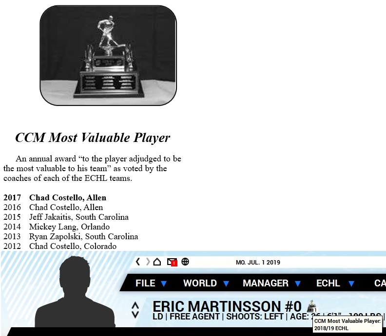 It does not seem that the ECHL has a specific award trophy for this, at least no photos can be found on the internet... Because of that I decided to add a "Placeholder" icon for this award as it is used in the ECHL in FHM 4 and FHM 5. Hope you like it! This award exists in both FHM 4 and FHM 5 but right now is not supported and displayed on details page of a general manager. Last edited by jh95; 11-01-2018 at 09:48 AM. |