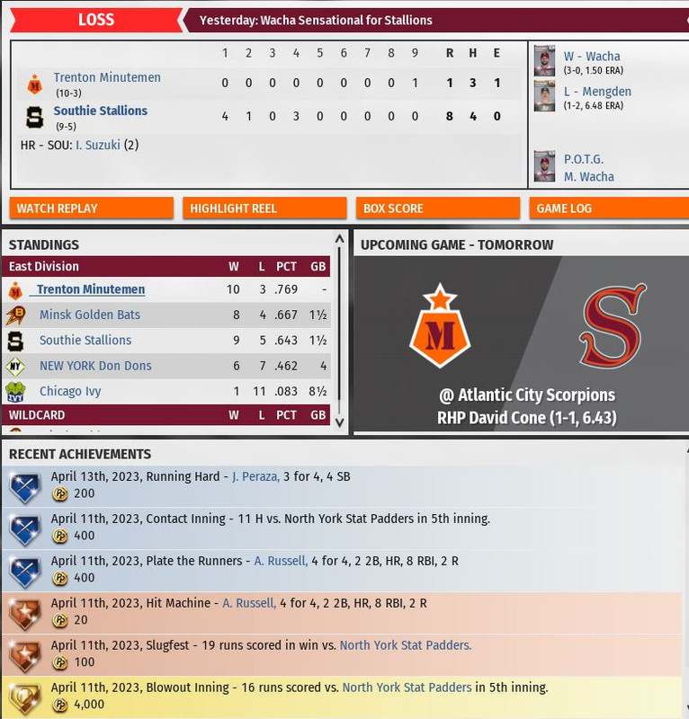 My Red and Gold teams are reunited in Gold .286 after being split in Silver and a Gold last year. And wouldn’t you know it - same division. Gold was 2nd in the Silver league last year but sadly got knocked out by a wildcard winner. Red didn’t have a good year in the Gold league at all. But both teams off to a decent start in Gold this time around. |