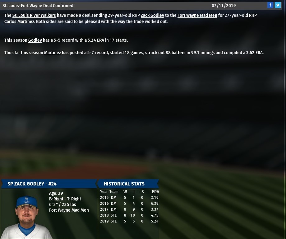 With the National League looking more competitive than it did a year ago, the St. Louis River Walkers took a chance on bolstering their rotation by trading making a trade with Fort Wayne, which would send right-handed pitcher Zach Godley to the Mad Men in exchange for right-handed starting pitcher.