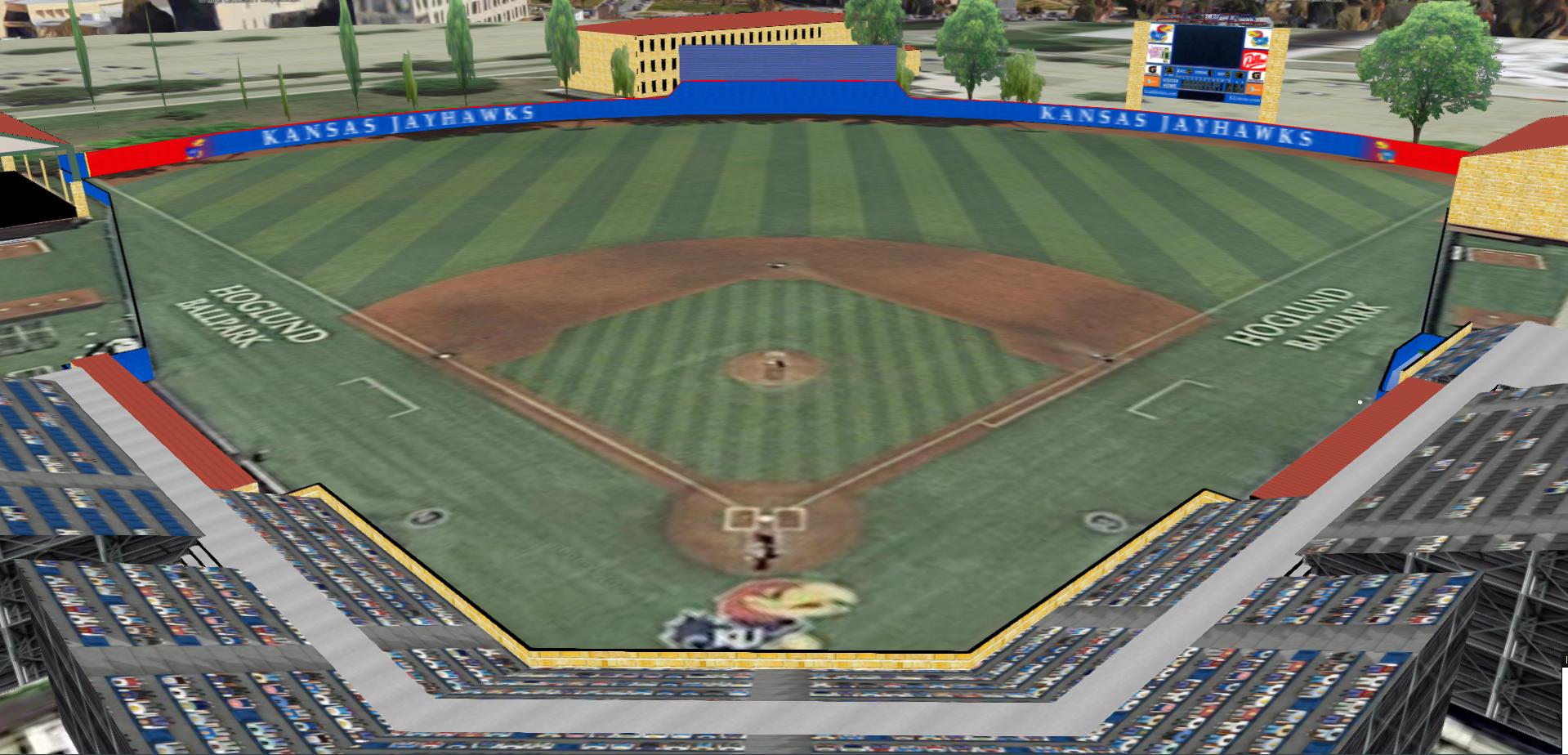 College	-	Kansas Stadium - Hoglund Ballpark Lat - 38.952955 Long - -95.252938 Capacity - 2500 LL - 330 LF - 355 LC - 370 CF - 380 RC - 370 RF - 355 RL - 330 LL - 8 LF - 8 LC - 8 CF - 15 RC - 8 RF - 8 RL - 8 LHB - 1.018 RHB - 1.003 2B - 1.097 3B - 0.956 HR LHB - 0.963 HR RHB - 0.988 |