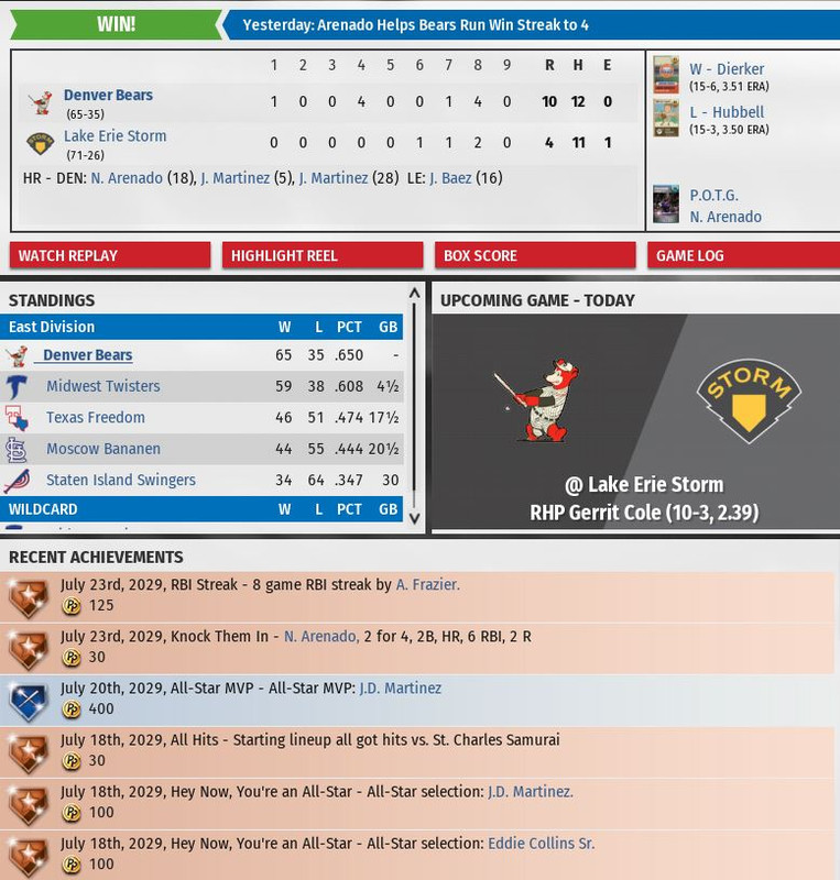 ![]() ![]() ![]() Denver Bears are at 63-35 and are in first place again. Miles Mikolas is 11-3, 3.97. Larry Dierker 14-6, 3.44. Randy Jones 10-5, 4.40 as well at Larry Jansen 8-5, 3.52 are doing well. JD Martinez is batting .329 and it is not even the All star Break and he has 86 RBIs and 27 HR. . And the Bears have 3 All Stars (Blake Treinen, JD Martinez, and Eddie Collins)
