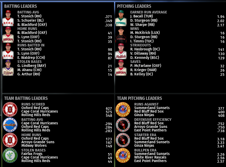 Saturday, August 2, 2059 RED CAPS ROMP IN TU NORTH When you have high-powered firepower and decent pitching, you can do well in the Islandian Pro Alliance... Crystal Lake, the reigning Pro Cup crownholder, is proof of that... that also fits the Oxford Red Caps (69-38) to a T... the Oxies are making shambles of the Tycobbian North with a devastating attack and OK pitching... the Red Caps have ballooned to a 10-game margin over last year's division winner, the Luxora Zorros (59-48), 13 better than the Fairfax Frogs (56-51) and 15 games ahead of the fourth place North Hills Hawks (54-53)... most baseball analysts would say the race is over. In July the Tycobbian North Division had a good month... 6 of the clubs posted winning marks... led, of course, by Oxford's 18-11 record... the Z's were 16-13... Frogs 17-12... Hawks 15-14... Blue Lake 16-13... the Hellcats and Rascals were the only losing clubs with 13-16... even the last place Haymakers were on the winning side of the ledger at 16-13. Tycobian North Outlook: Oxford has been terrific at the plate this season with a .284 BA (2nd), 627 runs (1st) and 173 HR (1st)... the Red Caps make it look easy with two All-Stars in the lineup: first baseman Buddy Blackford with a .338 BA, 41 HR and 86 RBI and LF Showboat Lynn batting .337 with 30 roundtrippers and 94 ribbies... and enough quality pitching to get by with Maury Statler (14-6/3.59), Meldon Eddington (15-4/3.33) and Wiley Beckford (15-5/3.73)... add in standout All-Star closer Pat McFarlane (3-3/1.40 ERA/32 saves/43 G) and you have a high-quality ball club... one that is pretty likely to win the pennant... and a team likely to be one of the favorites in the Pro Cup playoffs. Five teams are still in the chase for second place... Luxora has the best shot at it... the Zorros have two solid starters in Wallace MacPherson (15-6/2.83) and Mack McKitrick (16-6/3.06)... but the other three starters are lousy... the offense is also good with a .262 BA, 506 runs (6th) and 113 homers (9th)... evenly-matched Fairfax, North Hills, Blue Lake and Hartsdale will fight it out for the third spot on the TU North. KARATE KIDS ON TOP OF TU SOUTH One of the delights of the IPA season is on top of the Tycobbian South... the karate kids in Ginza (65-42) are kickin' butts with a 7-game edge over runner-up Turon (58-49)... third place Cape Coral (57-50) and Summerland (57-50) are still hanging around, but are 8 games behind the Ninjas... a lot of people are cheering and rooting for Ginza, which has not won a pennant for 28 years... maybe Mr. Miyagi can pull off another miracle. The Ginza Ninjas are not doing it with mirrors or martial arts, they are doing it with impressive pitching... they have three quality starters with Kurt Brophy (11-4/3.27), Yoshiro Makihara (10-8/2.62) and Franco Funicello (11-5/2.96)... plus two more reliables in Kenny Cabot (8-5/3.82) and Kodai Norimoto (7-6/3.98)... and in the bullpen All-Star closer Abram Worth (7-4/2.42 ERA/24 saves/49 G)... the team ERA is 3.42 (3rd)... the Ninjas do need help in the batter's box... they have trouble scoring runs despite a .264 BA (9th)... only 83 homers (25th) and 445 runs (23rd)... but Ginza wins ball games... the Ninjas went 17-12 in July, tied with Turon for the best record in the TU South... the Cape Coral Hurricanes did well at 16-13... the Summerland Sunsets slumped to 14-15... the Arroyo Grande Suns were 16-13... Colchester only 12-17... San Alejo 14-15... and eighth place Southport fizzled at 10-19, thus killing its chance for a second-half comeback... the Sun Sox won the TU South a year ago... but it ain't gonna happen this year... no way, Jose... no way no how. Tycobbian South Outlook: Ginza is sitting pretty in first place and should make the playoffs with its fine mound staff... second place Turon also has good pitching with a 3.49 ERA, but lacks offense and home-run power... the Typhoons are batting .259 (13th) with 450 runs (22nd) and only 71 HR (29th)... the Cape Coral Hurricanes will be in the battle for second place because of its robust attack... the 'Canes are thumping the ball at a .294 clip (1st), scored 575 runs (2nd) and have hit 97 balls out of the park (18th)... and they are not bad on the hill with a 3.98 ERA (17th)... Cape Coral looks like the runner-up this season... the Summerland Sunsets have the best pitching corps in the TU with a real good 3.08 ERA (1st), but they are batting a paltry .248 (29th) and only have 413 runs (31st)... it looks like fourth in the standings for Summerland... any one of the second-division clubs could wind up 5th... Arroyo Grande, Colchester, San Alejo and Southport are just about even in talent... the Tycobbian South is fairly even top to bottom... only 14 games separate Ginza from Southport. RED SOX UP BY 7 IN TU EAST In July the Red Bluff Red Sox (64-43) took charge of the Tycobbian East Division with a marvelous 21-8 record... they broke open a tight race and now have extended their division lead to 7 games over the High Mesa Mustangs (57-50), 8 games better than third place Tuckanarra (56-51) and 10 games over their big rival, the Midway Wolves (54-53)... the Mustangs could only muster a 14-15 mark... the Tucks 15-14... Middies 16-13... and the fifth place East Point Panthers finished the month at 14-15.... and as far as the TU East also-rans, only sixth place South Fork did well at 15-14... Ozarka was a dismal 11-18 and basement-dwelling Hillsboro had a shameful month at 8-21. Tycobbian East Outlook: Red Bluff is a shoo-in for the TU East division title... the club continued its fine mound work... the team ERA is 3.16 (2nd), sparked by starters Duane Sturgeon (16-6/2.02) and Wilson Sharpe (11-6/2.17)... the Red Sox also get the job done at the plate with a .258 BA (15th), 504 runs (7th) and 111 homers (10th)... slugging star RF Toni Kolkov (.279/27 HR/71 RBI), CF Paul Gaddison (.271/22 HR/69 RBI), LF Ian Driskell (.300/5 HR/40 RBI) and 1B Monty Lyons (.304/6 HR/33 RBI) are the prime run p