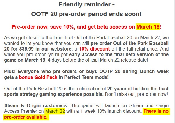 Then I must say the folder structure is massively messy, so when trying to "fix" anything you have difficulty to find were. Then if steam think you miss something they just reinstall whatever without you knowing a damn thing. They rule the game. Often in my mind. What happens if steam brakes down ?? OK for some it might be easier to install, but really this game isn't that hard to setup and you always keep control of any updates. Steam has found a brilliant middleway to make money on PC users that can't handle their PC. The idea to then get the rest in the fold too is just a master genius stroke. I really honor OOTP for still staying with the option on having steam or regular. Fewer and fewer game do this. Hopefully OOTP never have to bow 100% to Steam. |