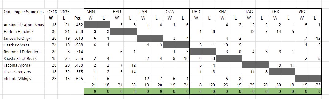Our League Standings - G316 - 2035 W L Pct Redmond Defenders 20 8 .714 Victoria Vikings 23 15 .605 Harlem Hatchets 30 21 .588 Ozark Bobcats 24 19 .558 Janesville Onyx 20 19 .513 Annandale Atom Smashers 18 21 .462 Tacoma Aroma 20 29 .408 Texas Strangers 18 30 .375 Shasta Black Bears 15 26 .366 x |