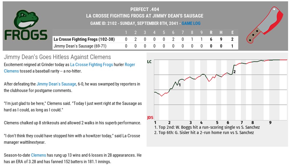 George Sisler was 5 HR and 3 SB shy of 30/30 as of my previous post, so he just decided to get that out of the way already. Logged in to see he's got 31 HR and 30 SB now...hmmm, 40/40 then? Maybe? Another first for the team...96 Roger Clemens tossed the Frogs' first ever no-hitter! Can finally cross that one off of my bucket list. I just wish he hadn't taken advantage of such a fine breakfast sausage. "I'm just glad to be here," Clemens said. "Today I just went right at the Sausage as hard as I could, as long as I could."