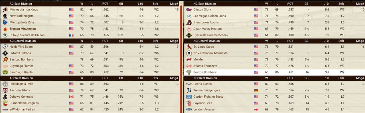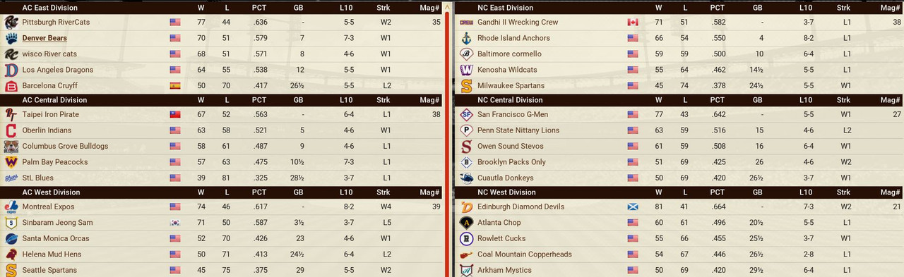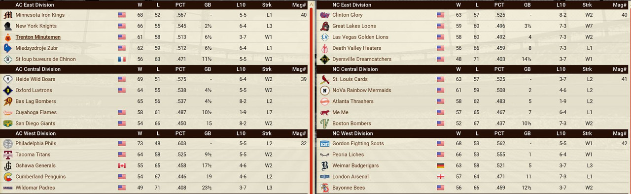 Reavers up 0.5 up but its a knife fight. They played to a 17-9 tune last month. Subway Rats are 0.5 back in their division and 0.5 up in the second wild card spot, went 16-11 in August. Last edited by Will_L; 08-31-2019 at 02:39 AM. |