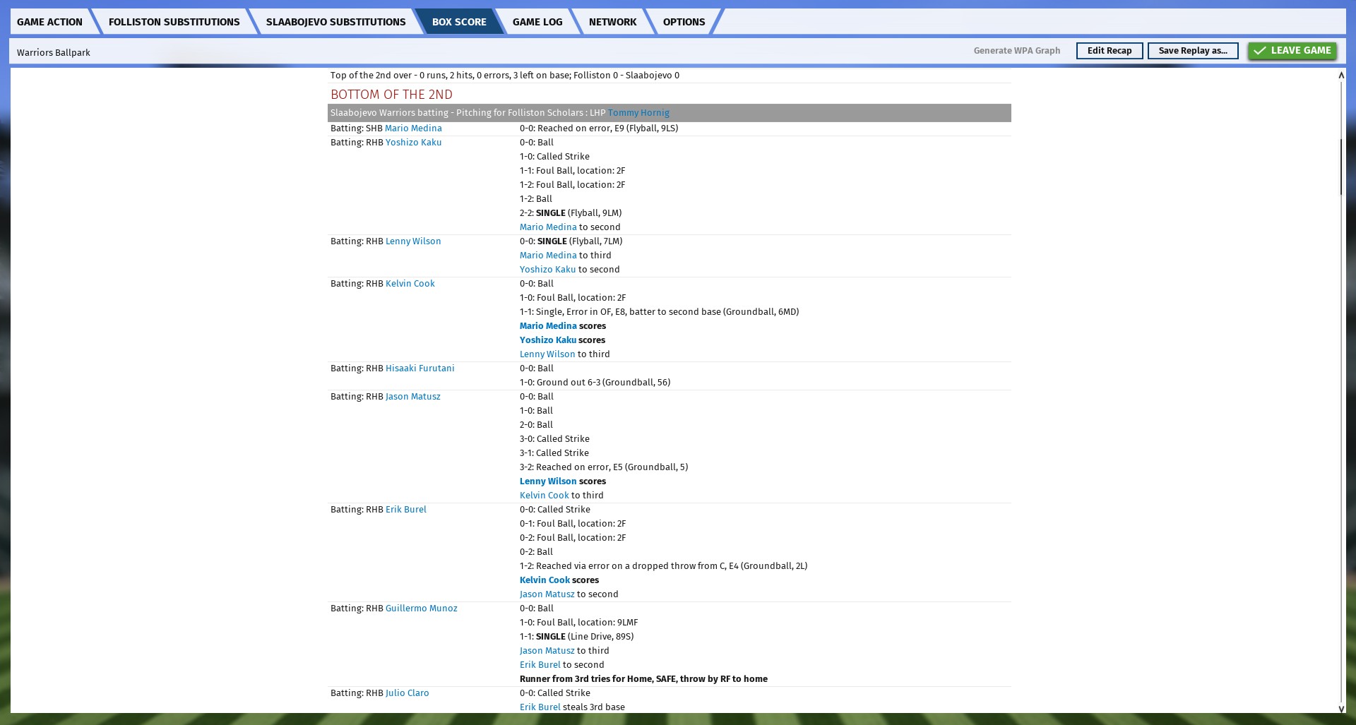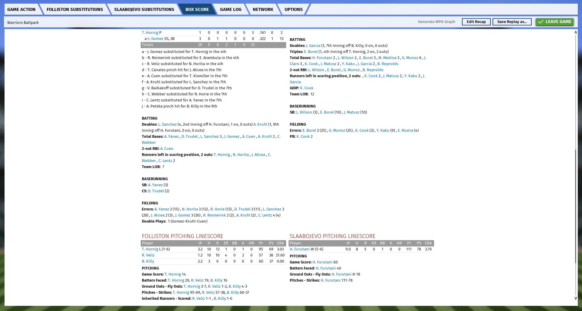 I'm posting the box score and the game log from probably the worst regular-season game one of my teams has participated in for any dynasty I've created before, in the next few posts. Many of the runs could probably have been prevented from scoring had certain players not failed to cover certain bases at times, I think. Or at least a few, anyway.