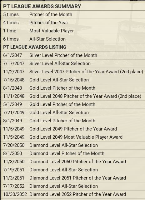 Compared with the previous few seasons, Huntley's postseason award tally was slight, as SS Luke Appling's 13th Platinum Stick Award was the only hardware earned by a Red Raider. Congratulations to all 2052 champions, and good luck in 2053! |