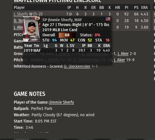yeah, the pitching side definitely needs some adjustments.... running a bronze team right now with nothing but relievers... just had a game where Jimmie Sherfy (stamina=16) went 7 innings with 92 pitches, only giving up 6 hits and 3 runs. |