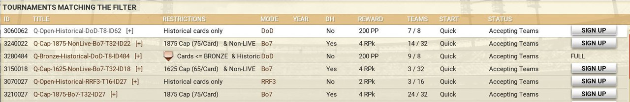 I also think that, perhaps for the next iteration of the game, you might like to eliminate the cap on players for your dailies/weeklies altogether. If you can incorporate byes in you should be good and then you can see how many people wanna play the daily silver (and the daily bronze once that comes out). I also think that, going forward, you shouldn't entirely eliminate the possibility that some tournaments have a "buy-in". I think that what you want to avoid is having a consolidation of currency that might occur if some players dominate these tournaments. So I would say, simply pay out card packs or cards as tournament rewards, never currency. Especially with regard to "sealed deck" tournaments where you open x packs and construct your team, which I hope you implement in some future iteration, I think buyins for some portion of your tournaments is not unreasonable. You will certainly make more money. I don't see how this is in any way a gambling mechanism, as you can never cash out. Just my two cents, I mostly hope you do the first two suggestions.