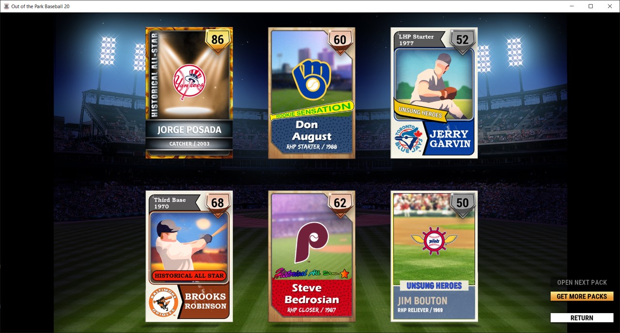 Summary by tier: Perfect 0 (expected 0) Diamond 0 (expected 1) Gold 29 (expected 28) Silver 19 (expected 15) Bronze 80 (expected 81) Iron 22 (expected 25) Individual cards by pack: Pack 1: 83 SP Mark Mulder (2003 Hardware Heroes) 77 RF Reggie Jackson (1977 All-Star) 67 2B Ron Hunt (1964 All-Star) 60 C Mike Matheny (2000 Hardware Heroes) 60 SP Micah Owings (2008 Unsung Heroes) 60 CL Dan Quisenberry (1982 All-Star) Pack 2: 87 CL Phil Regan (1966 All-Star) 68 SP Charlie Lea (1984 All-Star) 67 2B Steve Sax (1986 All-Star) 62 3B Sean Burroughs (2003 One Hit Wonder) 61 RF David Dellucci (2001 Unsung Heroes) 58 SS Kurt Stillwell (1989 Unsung Heroes) Pack 3: 82 SP Joe McGinnity (1903 Record Breaker) 71 SP Ken Hill (1994 All-Star) 69 3B Pepper Martin (1933 All-Star) 65 CL Luis DeLeon (1982 Rookie Sensation) 60 CF Bill Virdon (1962 All-Star) 40 SP Sugar Cain (1933 Unsung Heroes) Pack 4: 85 RF Mookie Betts (2016 All-Star) 65 SP Bill Voiselle (1948 Unsung Heroes) 63 SS Marty Marion (1944 All-Star) 62 CL Ron Perranoski (1970 Record Breaker) 60 C Mike Matheny (2000 Hardware Heroes) 60 SP Craig McMurtry (1983 Rookie Sensation) Pack 5: 87 2B Bobby Grich (1979 All-Star) 87 SP Jim Palmer (1975 All-Star) 66 C Jody Davis (1984 All-Star) 61 1B Frank Torre (1957 Unsung Heroes) 59 RP Alan Embree (2004 Unsung Heroes) 52 SP Rob Gardner (1965 Unsung Heroes) Pack 6: 84 3B Miguel Cabrera (2012 All-Star) 77 1B Dolph Camilli (1941 Hardware Heroes) 73 SS Carlos Guillen (2004 All-Star) 68 SP Hal Brown (1963 Record Breaker) 66 SP Red Barrett (1944 Record Breaker) 55 SS Jeff Blauser (1995 Unsung Heroes) Pack 7: 80 RF Ken Singleton (1977 All-Star) 69 LF Garret Anderson (2002 All-Star) 69 C Bob Boone (1988 Hardware Heroes) 66 LF Alex Johnson (1970 All-Star) 66 3B Rich Rollins (1962 Rookie Sensation) 59 2B Marty Barrett (1986 Unsung Heroes) Pack 8: 89 3B Wade Boggs (1989 All-Star) 83 SP Andy Messersmith (1975 Hardware Heroes) 69 CL Jack Aker (1966 Record Breaker) 65 C David Ross (2016 Unsung Heroes) 60 SP Don August (1988 Rookie Sensation) 60 RP Eddie Rommel (1920 Rookie Sensation) Pack 9: 85 RP Jesse Crain (2013 All-Star) 70 1B Ripper Collins (1935 All-Star) 67 2B Dave Stapleton (1980 Rookie Sensation) 60 CL Cy Acosta (1973 One Hit Wonder) 59 RP Alan Embree (2004 Unsung Heroes) 57 CF Cody Ross (2010 Unsung Heroes) Pack 10 (the "Gambler" pack): 88 RF Sixto Lezcano (1979 Hardware Heroes) 74 SP Dan Petry (1984 Unsung Heroes) 71 SP Kenny Rogers (1994 Unsung Heroes) 61 LF Jonny Gomes (2013 Unsung Heroes) 60 SP Kenny Rogers (2006 Hardware Heroes) 44 SP Mike Caldwell (1982 Unsung Heroes) Pack 11: 86 C Jorge Posada (2003 All-Star) 78 RP Steve Mingori (1971 Rookie Sensation) 65 SP Sterling Hitchcock (1998 Unsung Heroes) 64 3B Dave Hollins (1993 All-Star) 62 SS Spike Owen (1992 Unsung Heroes) 57 2B Joe Panik (2014 Unsung Heroes) Pack 12: 84 3B Eric Chavez (2001 Hardware Heroes) 70 CF Byron Buxton (2017 Hardware Heroes) 69 CF Rick Monday (1968 All-Star) 66 SP Whitey Moore (1940 Unsung heroes) 65 1B Kevin Maas (1990 One Hit Wonder) 58 LF Scott Podsednik (2005 Unsung Heroes) Pack 13: 89 SS Alan Trammell (1987 All-Star) 73 1B Steven Pearce (2018 Unsung Heroes) 63 RF Raul Mondesi (1999 Unsung Heroes) 61 LF Hideki Matsui (2003 Rookie Sensation) 60 2B John McDonald (2010 Unsung Heroes) 57 C Rick Dempsey (1983 Unsung Heroes) Pack 14: 82 SP Lance McCullers Jr (2017 All-Star) 72 CF Ken Berry (1972 Hardware Heroes) 71 LF Lou Brock (1964 Hardware Heroes) 68 C Salvador Perez (2017 All-Star) 65 C Paul Lo Duca (2003 All-Star) 43 SP Lew Burdette (1959 Unsung Heroes) Pack 15: 88 SP Scott Kazmir (2006 All-Star) 69 RF Ron Northey (1944 One Hit Wonder) 68 SP Steve Stone (1980 Hardware Heroes) 60 SP Chad Ogea (1995 One Hit Wonder) 60 SP Ron Romanick (1984 One Hit Wonder) 44 SP Mike Caldwell (1982 Unsung Heroes) Pack 16: 85 SP Bob Friend (1956 All-Star) 69 LF Charlie Keller (1943 All-Star) 66 CF Peter Bourjos (2011 One Hit Wonder) 65 CL Roy Face (1962 Record Breaker) 64 1B Luke Easter (1952 Unsung Heroes) 61 1B Heinz Becker (1945 Unsung Heroes) Pack 17: 85 SP Harvey Haddix (1953 Rookie Sensation) 68 RF Ken Griffey Sr (1976 All-Star) 67 SP David Clyde (1973 Unsung Heroes) 64 CL Will McEnaney (1975 Unsung Heroes) 60 SP Bronson Arroyo (2010 Hardware Heroes) 44 SP Jeff Weaver (2006 Unsung Heroes) Pack 18: 82 SP Hal Schumacher (1933 All-Star) 71 RP Sandy Koufax (1957 Record Breaker) 65 SP Johnny Morrison (1925 Unsung Heroes) 64 3B Chipper Jones (1995 Rookie Sensation) 60 SP Joe Mays (1999 Rookie Sensation) 55 SS Munenori Kawasaki (2013 Unsung Heroes) Pack 19: 89 RF Hank Aaron (1959 All-Star) 67 CF Jackie Bradley Jr (2018 Unsung Heroes) 63 C Bo Diaz (1986 Unsung Heroes) 61 CL Antonio Alfonseca (2000 Hardware Heroes) 49 C Joel Skinner (1988 Unsung Heroes) 43 RP Paul Spoljaric (1998 Unsung Heroes) Pack 20: 88 SP Sam McDowell (1970 All-Star) 78 SP Bill C Lee (1938 All-Star) 68 RF Andre Ethier (2009 Hardware Heroes) 66 3B Stan Hack (1941 All-Star) 61 1B Donn Clendenon (1969 Unsung Heroes) 56 SP Joe Oeschger (1920 Unsung Heroes) Pack 21: 82 2B Sammy Hughes (1939 Legend) 70 C Ted Simmons (1983 All-Star) 69 SS Jimmy Rollins (2005 All-Star) 67 SP Dave Stenhouse (1962 One Hit Wonder) 50 C Carlos Ruiz (2008 Unsung Heroes) 40 SP Sugar Cain (1933 Unsung Heroes) Pack 22: 83 SS Bobby Crosby (2005 One Hit Wonder) 76 1B High Pockets Kelly (1924 Legend) 74 SP Dan Petry (1984 Unsung Heroes) 65 2B Harold Reynolds (1990 Hardware Heroes) 63 LF Lee Mazzilli (1986 Unsung Heroes) 62 CF Milt Cuyler (1991 Rookie Sensation) Pack 23: 88 SP Mike Hampton (1999 Hardware Heroes) 82 3B Howard Johnson (1989 All-Star) 70 SP Randy Jones (1976 Hardware Heroes) 65 SP Lou Brissie (1950 Unsung Heroes) 65 SP Phil Hughes (2010 All-Star) 50 SP Jose Lima (2004 Unsung Heroes) Pack 24: 88 SP Frank Viola (1990 All-Star) 85 CL Mark Littell (1978 Record Breaker) 77 CL Kent Tekulve (1979 Hardware Heroes) 67 SP Gary Gentry (1969 Rookie Sensation) 65 2B Jorge Orta (1975 All-Star) 60 2B Mickey Morandini (1997 Un
