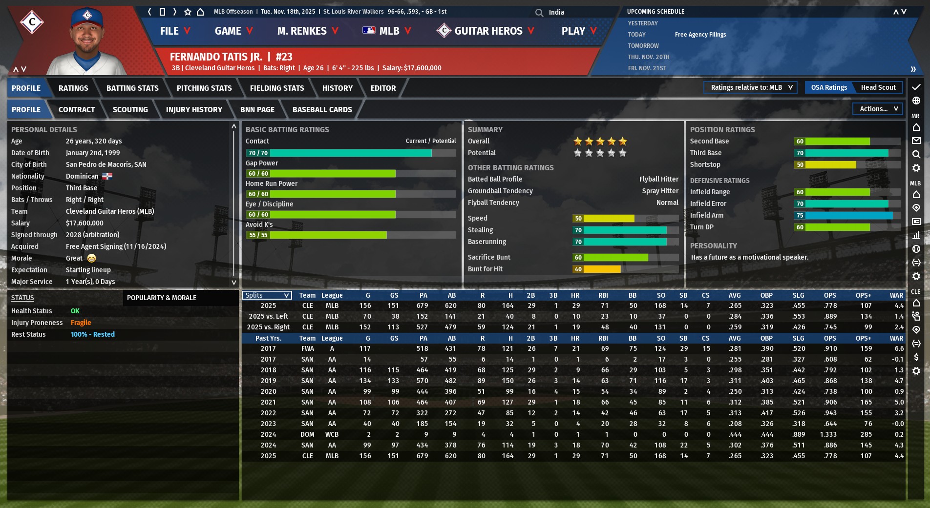 I made the trade. We're nine games into the season and Tatis is batting .233 with 2 HRs, 5 RBIs and a .761 OPS. The fragile tag concerned me but he has not had more than a 6-day injury, and just one of them in a season-and-a-half. Our trainer also boasts a great rating -- with a specialty of prevention -- and I cannot recall many really lengthy injuries to position players since I took over in 2018. This team won the World Series in 2025, but its best offensive players are 31 and 32, respectively, and I felt I needed another thumper if I wanted to repeat. |
