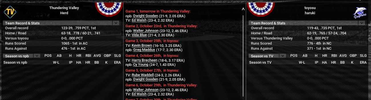 I have no idea I must say but I kinda like the Thundering Valley Herd to win their first Perfect championship. What we have here is a 1065 offensive juggernaut vs. a 371 runs allowed defensive wizard... Why do I pick the Herd? I know the last game didn't show it, but I scored some runs against them & except for the last 2 games of the regular season it was a bad season at the plate for me... The only thing is...TV has to outscore them 4 times...and Haruki could easily have 4 "Nobody scores against this" performances in them. We'll see. We'll have to put the good pitching beats good hitting thing to rest if TV comes out victorious.