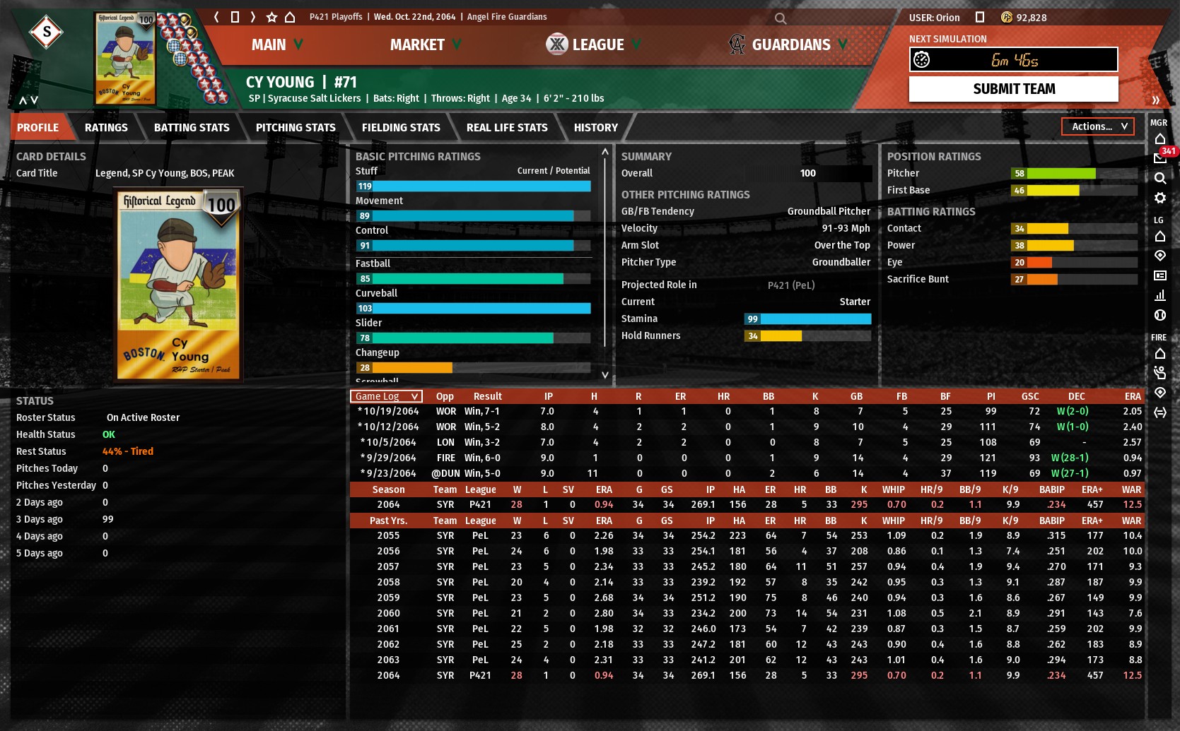 Ended up falling behind 0-2 in round 1 but rallied to win as Mussina came through. In round 2 I face a whale who has a bunch of Perfect Championships. I got blown out in game one, but came back to hit 4 HR's....and give up 6 HR's and lose game 2 14-11.