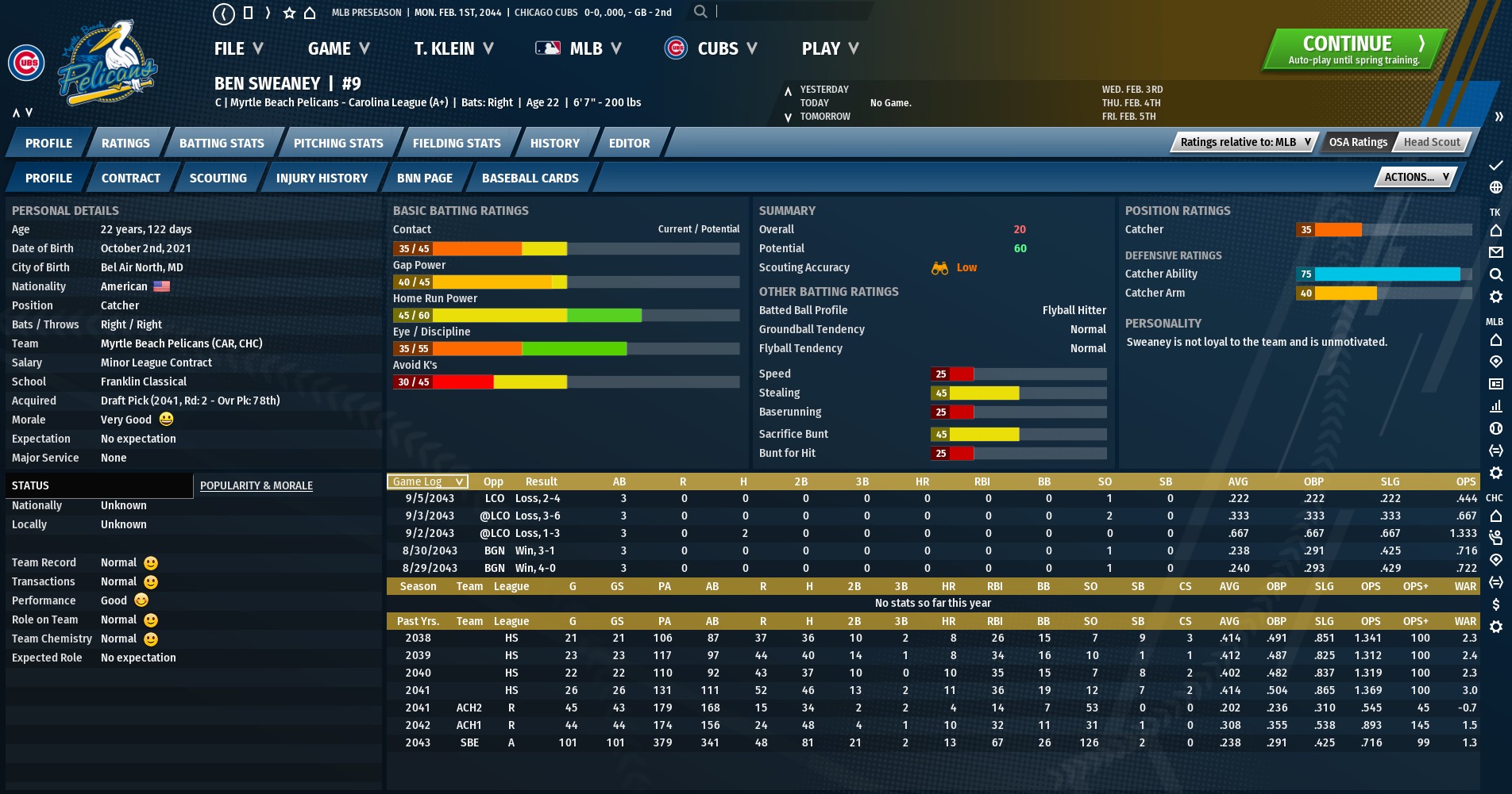 Something to bear in mind is that AI managers often won't play guys with no C rating at catcher even if they're prime catcher prospects. You'll want to watch for those oversights and force start them at catcher.