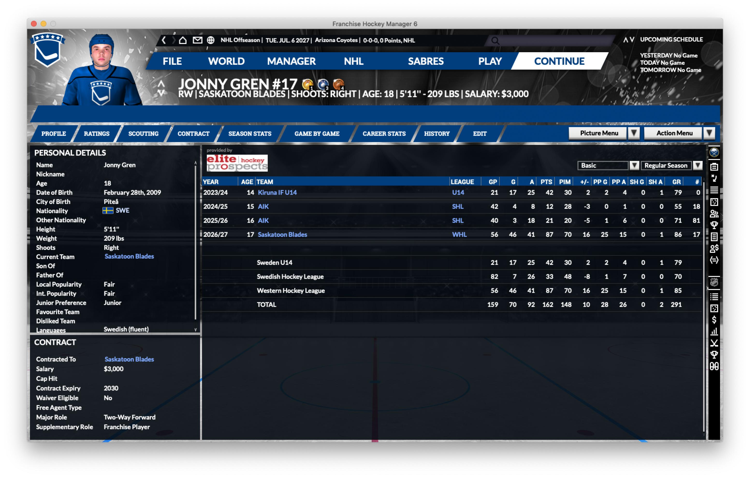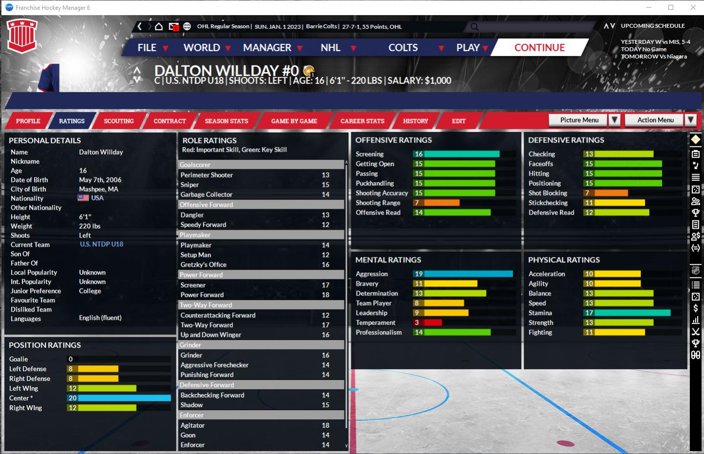 I am doing my Barrie Colts Dynasty in FHM 6 in the 5th year and came accross this beast. He was 1st line C for USA at world juniors at 16yo and got 24 minutes in the game.