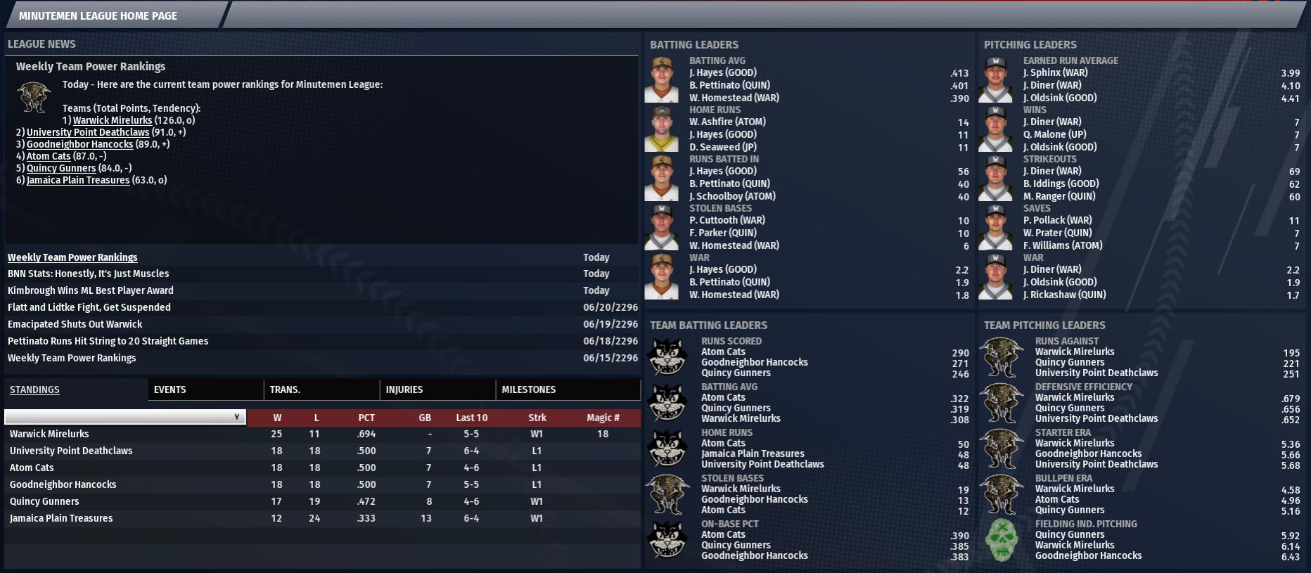Today in the CBO News and Notes - Reports from around the Commonwealth by Nat Wright-Kowalski 1 July 2296 - Batters of the Month BL - BL Batter of the Month Honors to Treestump: For being a 5th-round pick, Chris Treestump certainly put together a successful month. It was good enough to win the BL Batter of the Month award for June. The 18-year-old right fielder for the Salem Witch Hats hit .440 with 4 home runs, 19 RBIs and 14 runs scored. So far this season Treestump has hit .345 with 9 home runs, 43 RBIs and scored 32 times. IL - Qesadena Wins Best Bat Trophy in June: At only 16 years of age, Willie Qesadena could very well be having many more months like the last this in his career. That would be great news for fans of the Starlight Lady Killers, as June was one to remember for the first baseman and he has captured the Institute League Batter of the Month award. On the month he hit .420 with 5 home runs, 20 RBIs and 14 runs scored. So far this year Qesadena is batting .350 with 9 home runs, 44 RBIs and 36 runs scored. ML - Torrid June Gets Seaweed ML #1 Batter Trophy: Jamaica Plain Treasures fans believe they've got a talented young star in David Seaweed. He did nothing to dissuade that notion in June, as he hit .429 with 7 home runs, 12 RBIs and 16 runs scored. The end result was the right fielder being named the Minutemen League Batter of the Month. In 39 games this season Seaweed has batted at a .386 pace with 61 hits and 13 home runs. RL - RL Best Hitter Trophy Goes to Perez: When B.J. Perez stepped up to the plate in June he did it with confidence, and today he was honored with the Railroad League Batter of the Month award. The young Oberland center fielder posted a .517 batting average with 2 home runs, 14 RBIs and scored 17 runs. Perez also worked pitchers for 2 walks to post a .541 on-base percentage. This year Perez is hitting at a .439 pace with 4 home runs and 35 RBIs. He has played in 39 games and scored 45 times. 1 July 2296 - Pitchers of the Month BL - Artman Best BL Starter in June: Terrence Artman took a much-deserved turn in the spotlight earlier today as he accepted the Brotherhood League Pitcher of the Month award for June. The 27-year-old Witch Hats starter earned his second Pitcher of the Month award, racking up an impressive 3-1 won-lost record in 4 starts. This month he fanned 27 batters in 26.1 innings and compiled a 4.44 ERA. Checking out his stats for the season, Artman has registered 9 wins and 4 losses in 14 starts, 5.25 ERA and struck out 76 batters in 96 innings. IL - Fusion Earns IL Top Pitcher Trophy: Tim Fusion has made fans throughout Institute League take notice over the past month with an exceptional 3-0 record. No pitcher in the Institute League threw better in June, garnering him the Pitcher of the Month award today. In 4 starts Fusion compiled a 2.70 ERA, putting up a 3-0 record, striking out 23 and tossing 30 innings. Thus far this season, Fusion has tossed 95.2 innings in 13 starts, fanned 86 batters, walked 24 and put up a 3.29 ERA with 7 wins and 3 losses. ML - ML's #1 Starter is Malone: Quentin Malone, a 26-year-old starter and the University Point Deathclaws' first-round pick, won the June Pitcher of the Month award. In June, he topped off the month with a 3-0 mark and 3.94 ERA in 4 starts, tossed 32 innings, fanned 31 and held opposing teams to a .240 average. This year Malone has compiled a 7-2 mark with a 4.89 ERA. RL - Bush Gets RL #1 Pitcher Trophy: Over the past month Papa Bush has turned quite a few heads. He's young, talented and able to pitch with the established arms in the Railroad League. He proved all that and now he's been named June's Pitcher of the Month. The 9th-round pick for the Oberland T-51s posted 4-0 mark and a 4.22 ERA. In 4 starts he tossed 32 innings, permitted 40 hits and fanned 25 batters. This season to date Bush has a record of 7 wins and 1 loss with a 6.20 ERA, has appeared in 11 games and struck out 48 in 65.1 innings. 1 July 2296 - Abernathy-East Boston Prep Trade: DiGrande and Behr for Pitones Trade winds have been blowing through Abernathy. This time, a deal has materialized between the Adamantium and Assaultrons. According to sources inside the organization, Abernathy will ship 17-year-old LHP Zach DiGrande and 17-year-old RHP Chad Behr to East Boston Prep for 17-year-old RHP David Pitones. DiGrande, the 24th pick for the Adamantium, has appeared in eight games on the season. In 16.2 innings pitched, he has allowed seven earned runs on 16 hits with 13 walks and 21 strikeouts. He is 1-0 with a 3.78 ERA. Behr started one game for Abernathy. In that start, he had a no decision in 6.2 innings, allowing six hits with two walks and seven strikeouts. He allowed one earned run for a 1.35 ERA. Pitones, who has been traded for the second time this season, has appeared in a total of 15 games for both The Slog and East Boston Prep. In those games, he allowed 15 earned runs on 33 hits with five walks and five strikeouts. He is 0-1 with a 6.64 ERA. Pitones was originally signed by the Ghouls as an undrafted free agent, but Abernathy seems to believe he may have more long-term potential than both DiGrande and Behr.