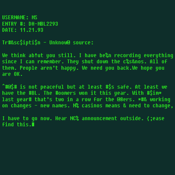 **** explored a hideout that appeared to belong to the Mysterious Stranger, at least based on the tell-tale fedora and trench coat hanging on the coat rack and the initials M-S as the username. Obvious. The terminal had lots of entries on it. **** leaked them anonymously to Piper Wright. Nate wanted to know how she got them, where they came from, and if they were even real. The information was recorded onto a holotape, so that is all that Piper knew. Nate did not seem to know what the information meant. I know. And so on.
