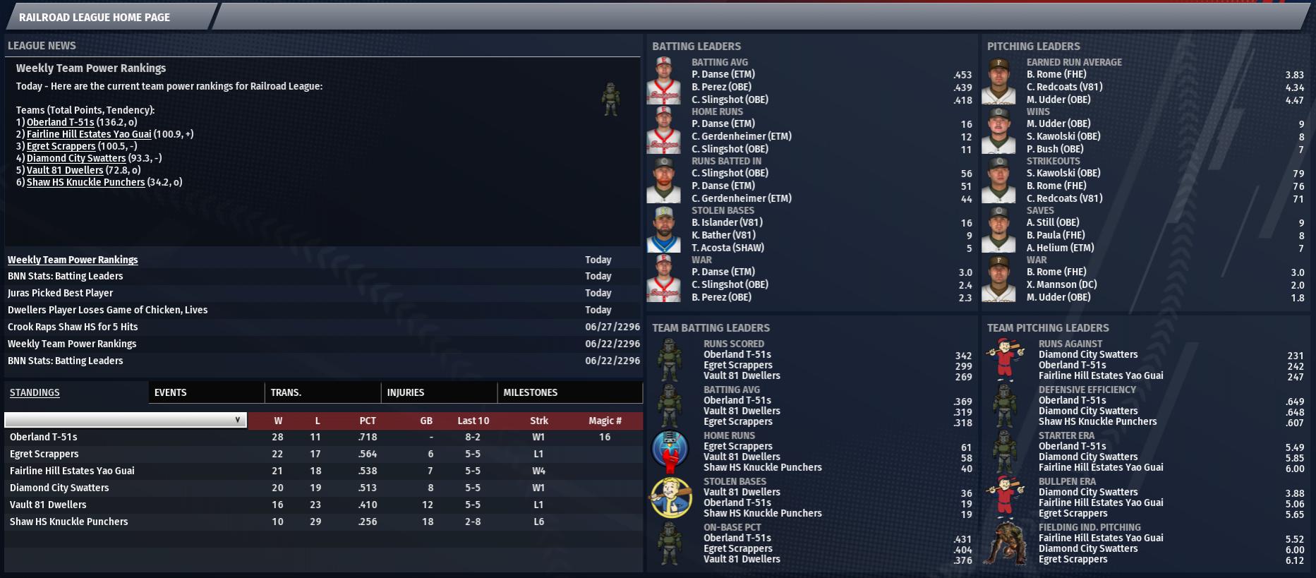 Today in the CBO News and Notes - Reports from around the Commonwealth by Nat Wright-Kowalski 2 July 2296 - Red, White, and Blue Weekend for the CBO Despite the Commonwealth being a shell of the former United States of America, this weekend has been a celebration for what Commissioner Nate Howard has called his own "nostalgia." Howard, as we all know, was alive before the Great War that turned our land into the Wastes we have grown to love and hate. He was also a decorated soldier who served in Operation Anchorage, a war-time occupation by the country China in the United States. This weekend, as a celebration of the USA's founding 520 years ago on July 4, 1776. This land that we call the Commonwealth was actually one of 13 Commonwealths across the United States. The Boston area was actually part of the New England Commonwealth. And in our own celebration, we are not official, but we have been operating under our own United Commonwealth ever since Howard defrosted from Vault 111. This weekend, Howard has proposed that ballparks serve the usual refreshments, but he wanted to add a recipe of his own to each of the 12 hosting ballparks' menus. He calls that item a "hot dog." It includes ground brahmin or dog meat set in brahmin intestinal casings and it is put on top of wet-mashed and baked razorgrain made into what he calls "bread." On top of the "dog" he places a softened paste mixture of mashed tarberries, mutfruits, and tatos that he calls "condiments." Howard said his version of the hot dog is not the same as it was in 2077, but it should be a new, tasty treat he hopes will become popular at the ball parks. Happy Red, White, and Blue Weekend, CBO! 3 July 2296 - Greenzone Ups Hit Streak to 20 Consecutive Games The hitting streak for The Slog left fielder Po Greenzone now stands at 20 games, but the Ghouls dropped today's contest 11-7 to the Finch Farm Four Leafs. Greenzone went 1-for-4 in the game. "Things went well for me personally today," he said later. "I got 1 hit and the streak keeps going. But we didn't win the game." Po Greenzone hit a sac fly in the 1st, struck out in the 3rd, grounded out in the 5th, singled in the 6th and flied out in the 8th. So far this season Greenzone has put up a .331 batting average with 46 hits, 14 home runs and 40 RBIs. 3 July 2296 - Tarberry Goes 5-for-6 After a 5-hit effort to lead Atom's 12-9 victory over the Jamaica Plain Treasures, center fielder Ed Tarberry told BNN beat writers it had been "a special day." "It really doesn't matter whether it's sandlot ball, high school or college, two hits in a game is nice," he said. "Three or four is better, but five or more is out of sight. And to do that at the Minutemen League-level is really something special." The 22-year-old player earned his accolades today at The Treasure Box with a spectacular 5-for-6 game against the Treasures. Tarberry singled in the 1st, singled in the 3rd, doubled in the 4th, hit an RBI single in the 5th, grounded out in the 7th and hit a two-run single in the 9th. In 41 games this year Tarberry has posted a .362 average and put up these numbers: 4 home runs, 35 RBIs and 39 runs scored. 3 July 2296 - Mustang Whitewashes Knuckle Punchers In an outstanding mound performance, Vault 81 Dwellers starter Josh Mustang fired a complete-game shutout against the Shaw HS Knuckle Punchers at McNamara Park today. Mustang was the key to the Dwellers's 7-0 win. The 31-year-old right-hander was in high spirits on the mount for much of the game, his mood largely undented by the 6 hits and 1 walk he allowed. "6 hits?" he said with a laugh following the game. "Listen, I'd be happy with a 30-hitter as long as it was a shutout." In 14 starts this season Mustang has notched a 5-4 record and a 5.60 ERA. 3 July 2296 - 5 Hits for Dwellers' Islander Bubb Islander did a number on the Knuckle Punchers in the Vault 81 7-0 victory today, and the number was 5. The Dwellers second baseman banged out 5 hits in 5 at-bats at McNamara Park to lead his club past the Shaw HS Knuckle Punchers. "I felt good in the batter's box today," he said later. "I had confidence in my swing and knew that it was there and that I could get the job done." Bubb Islander singled in the 1st, singled in the 3rd, singled in the 4th, singled in the 6th and singled in the 8th. This season Islander is batting .392 with no home runs. His totals include 16 RBIs and 29 runs scored. 4 July 2296 - Perez Belts 5 Hits It was a big day for B.J. Perez and he brought the Oberland T-51s along for the ride. Perez led his club to a 14-8 victory over the Diamond City Swatters today at The Great Green Jewel, smoking Diamond City pitching for 5 hits in 5 at-bats. The 19-year-old center fielder later called the victory "sweet." B.J. Perez walked in the 1st, singled in the 2nd, hit an RBI triple in the 4th, hit an RBI single in the 5th, singled in the 6th, grounded out in the 8th and singled in the 9th. Perez is hitting .454 in 2296 with 39 RBIs and 4 home runs. 4 July 2296 - Levy Has 20-Game Hitting Streak Mushy Levy continued his streak at Beantown Brewery Stadium today, even as the ballgame did not go his way. The County Crossing right fielder was 2-for-5 in today's contest and now has hit safely in his last 20 games. The Bloodbugs were not as fortunate, losing 8-6 to the Salem Witch Hats. "Levy was hitting everything we threw at him," said Salem player-coach Josh Historybuff. "He is a tough out. Fortunately, things went our way in the ballgame today and we came away with a win." Levy grounded out in the 1st, hit an RBI double in the 4th, singled in the 5th, grounded out in the 6th and struck out in the 8th. Looking at his season stats, Levy has compiled a .318 batting average and a .370 on-base percentage, while hitting 11 home runs and driving in 43 runs. 4 July 2296 - Rogers Goes on Rampage Against Ghouls All game long, Finch Farm's Ginger Rogers was rattling the walls at Tarberry Field Forever and banging out base hits against the The Slog Ghouls. When