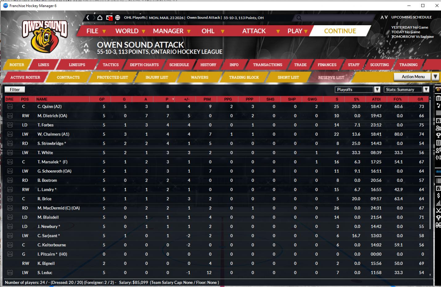Andrey Misin (G) - Russia Wade Chalmers (LW) - Canada Connor Quinn (C) - Canada Tomas Marsalek (C) - Czech Republic Matt MacDermid has assumed the #1 defenceman role and team captain with the departures of Noah Cochrane and Madden Steen. He is having a tremendous season from the blueline, leading the team in scoring. The Winnipeg Jets own his NHL rights and have to be salivating at the chance to have him patrol their blueline possibly as early as next season. Wade Chalmers is now 2nd in Owen Sound history in goals and points and should break Bobby Ryan's record of 325 career points. Chalmers, to this date, has been my only 20 rated player and has been a scoring machine since his rookie campaign. A bunch of younger players have made their marks this season with the Attack. Our center depth is really thin and we still might make a deadline move to acquire a top notch goalie to make another run at the OHL crown. Look for Owen Sound to circle the trade market this season to add some depth, especially with a bunch of injuries. Meanwhile, the defending Memorial Cup champs from out West, the Calgary Hitmen are cruising along again with a 28-2-1 record. It's way too early to say but could there be a rematch of last year's Memorial Cup final this year???? My trade rules are the following. For forwards and defencemen, I only trade for players that the CPU puts on the trade block. For goalies, I only look at teams who are not contenders for the OHL playoffs as realistically, they would be moving goalies in trades if it made sense for them. I'm also emulating real life OHL draft pick rules and not trading for multiple first round picks. |