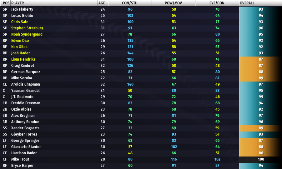 Yeah, my two theme teams have stagnated. The Buckeyes are an Indians themed team. Its bouncing between Silver and Bronze, but mostly hovers around Bronze. I make the playoffs in Bronze almost every year, but this is only the second time I've been promoted to Silver. And like the last time, winning at a sub .400 rate is guaranteeing that this team will be back in Bronze in season 2038. True to life, the Indians themed team can make the playoffs, but has yet to win a world series. LOL. (Caveat: My one non Indian still on the team is a locked 100 Verlander from prior to theming up-I use him due to being piqued that I can't sell him) My Rotation is the aforementioned Verlander along with 96 Feller, 91 Lee (If you played for the Indians, you qualify for my team), 91 Nagy and 86 Flounder...err Greg Swindell. I have a locked 92 Bieber that seems to suck 3 out of every 4 seasons so he stays in reserves. I'd QS him, excepted for that locked thing. I also have a 93 Sam McDowell that with a 44 control seems to struggle in Silver. (He's my favorite all time Indian) I have an all gold bullpen that is very inconsistent.