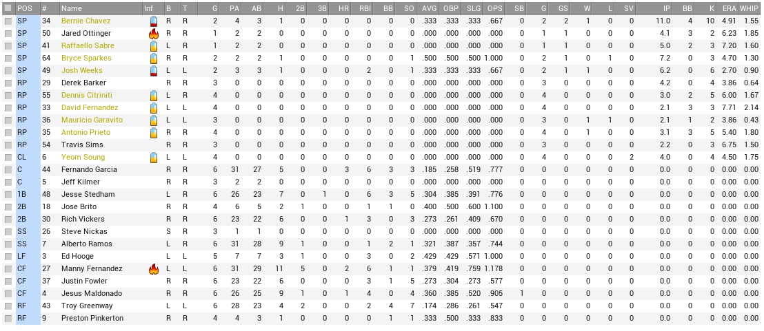 Cristiano Carmona showed me lots of silly tables and colorful graphs that looked like a toddler on sugar cubes had fallen into a bucket of crayons, but in the end he convinced me that the Raccoons should not part with Alberto Ramos. His defense was going to be a problem, yes, especially since the Raccoons’ pitching staff relief on defense due to overall low K/9 values. Where starters were concerned, Sparkes led the team at 7.3 K/9, and the rest of the flock huddled around the 6 K/9 mark.