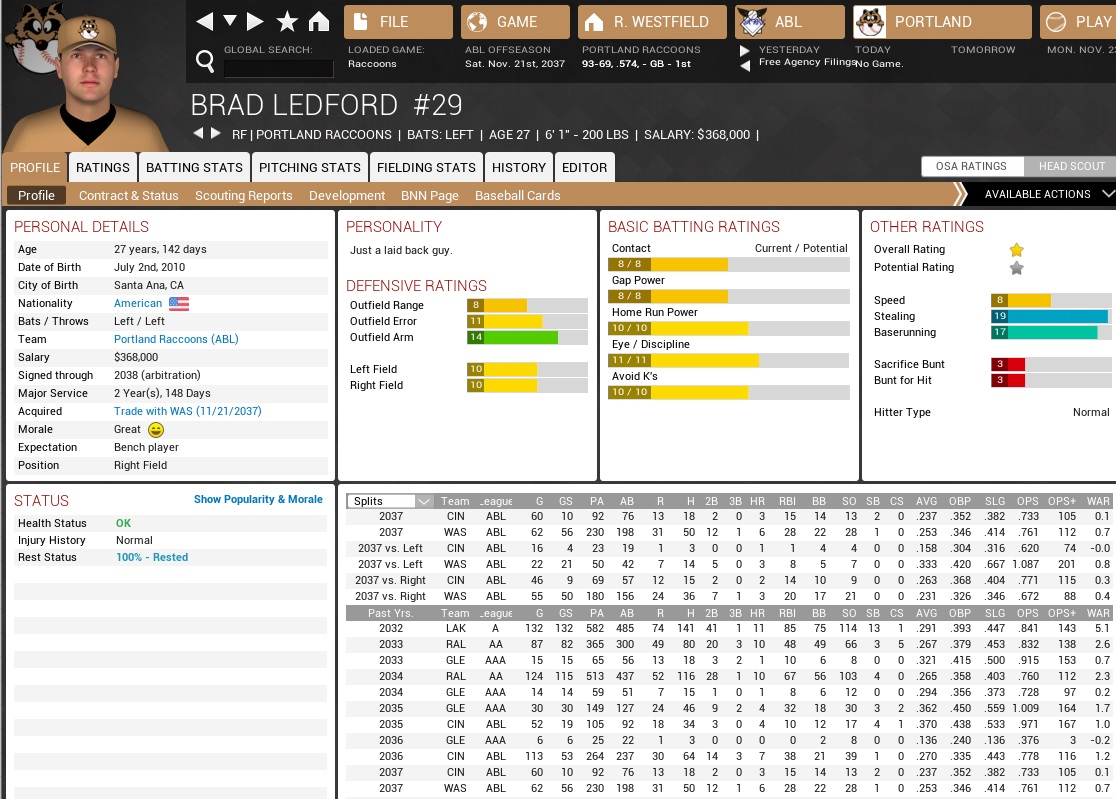 Without a ring. Back in the office, I learned of Nick Valdes’ great disappointment with the result of Game 7, that he’d have to adopt a more hands-on approach to this routinely failing baseball team and visit for all the home games, and finally also of the new budget. For 2038, the Raccoons’ budget would increase the budget to $40.5M, the first time we’d spend above the big four-oh mark, which was up $1.5M from ’37, but we actually dropped from being tied for 9th in the league to sitting alone in 11th place. The rich guys in the league where the Pacifics ($49.5M), Capitals ($48.5M), Condors ($47M), Titans ($45.5M), and Warriors ($43.5M). This included a $7.5M slash for the Titans! At the bottom of the league there’d be the Aces ($31.5M), Thunder ($30M), Falcons ($26.8M9, Rebels ($24.2M), and Loggers ($23.4M). The missing CL North teams sat in 13th, a tie between the Crusaders and Canadiens with $38M, and 19th, with $32M in the Indians’ coffers. The average budget was $37.95M, about $650k more than a year ago. The median budget amounted to $38.75M, which was up a whopping $2.75M from last season. +++ Of our $40.5M, about four fifths were already invested in some players (not including costs for coaching, scouting, and all the other side hustles!), and here we came to the meat of the offseason conundrum right away. The Raccoons figured to pay a total of $7.58M to three players who’d be in a contract year in ’38 and who for one reason or another had huge red notes attached to their scouting reports. There was Justin Fowler, now devoid of a centerfield rating, or in fact any positional rating. According to Cristiano, he had cost the Raccoons more than two wins just by standing on the grass out there, or in other words, almost everything he had gained them with 33 homers and 103 RBI. Net, his WAR was +0.3 … Berto was the other player without a position rating in the newest scouting report. He was due $2.5M … and that was a team option. The mere thought of dumping Berto drove tears into my eyes. Cristiano said he had been a net negative defender, but not much worse than his long-term average. He had not batted for *a lot* the last two years, part of the problem being .290-ish BABIPs, which was a bit below average. However, even then he had still been worth +2.4 WAR. Not that WAR was not a useless stat, but I liked weaving it in when it fit my narrative… And then there was Colt Willes ($1.58M), whose arm had basically fallen off after two weeks with repeated grim injuries. He had made only 19 starts in the last two years, all in ’36, and had only pitched in 10.1 innings this year, piling up an 11.32 ERA. By all accounts, he was done, and the Raccoons were stuck with his contract. Who else drew a paycheck he didn’t merit? Not that many, although there was Sabre pitching thoroughly average for $2M, and then there was Stedham, batting .239 with 14 homers for $2M and +2.0 WAR, but if the BABIP argument was good for Berto, it was even better for him. His had been .267… So yeah, the BABIP had been terrible early on for many, but some of them never recovered. Hooge (.270), Maldonado (.259), Kilmer (.217!) were other regulars (at least initially) that kept being screwed over all year long by the baseball gods. Fowler, too – his BABIP ended up being a miserable .243, but then again, his batting was not our chief concern… +++ Salary arbitration was not as crowded as usually, partly because the team was full of old farts, and because f.e. Manny Fernandez and Troy Greenway were of that certain age but had been bought out for long-term contracts already. The Raccoons had three free agents (none of them compensation-eligible) to bother with: Fernando Garcia, who had been a great help after coming over, and relievers Derek Barker and Nate Ward, also mid-season pickups. Ward had been quite terrible, but Barker had been about infallible, pitching to a 1.32 ERA for the Coons. However, he was a 33-year-old righty, so what were the chances he’d repeat that feat? Garcia was worth a discussion, but had made $1.6M in ’37 and something like that was not in the books as long as we didn’t part with another big contract. I mean, in the end we’d still have Tony Morales as the primary component of the catching platoon, since he was the left-handed batter. There was no point whatsoever in paying that amount of money to a guy that might get 200 at-bats. For true arbitration candidates we had Bryce Sparkes, Antonio Prieto, Rich Vickers, Ed Hooge, and Preston Pinkerton. The pitchers were without a doubt of value; Sparkes was arbitration eligible for the final time. Hooge was as spiffy a fourth outfielder as the Raccoons had longed for to have for a very long time (fawning about Eddie Jackson again now…). What was in there for Vickers? He was a right-handed second baseman and ultimately a dime a dozen. We had a younger guy with the exact same profile pushing up in Jose Brito, and never mind that the position is ultimately blocked by Cosmo Trevino for the foreseeable future. The Raccoons were looking for a left-handed addition to the bench for sure, too. Preston Pinkerton? Novelty and usefulness had worn off quite a bit here, and it was probably time to part ways, which was likely to end his career altogether. Yeah, his BABIP had been a shocking .221; the entire team had gotten nothing but screwed by the baseball gods for the entire season, why would he be an exception? What is it, Maud? – Nick Valdes can call another six times, I don’t give a ****. – Then tell him again, we CAN NOT replace our middle infielders with short-skirted ladies to increase attendance in the stands. – Make something up. League won’t allow it. Which is probably true. They also told me off when I used to grease the opposing team’s dugout stairs and railings in the 80s. Valdes. Such a lovely bugger.