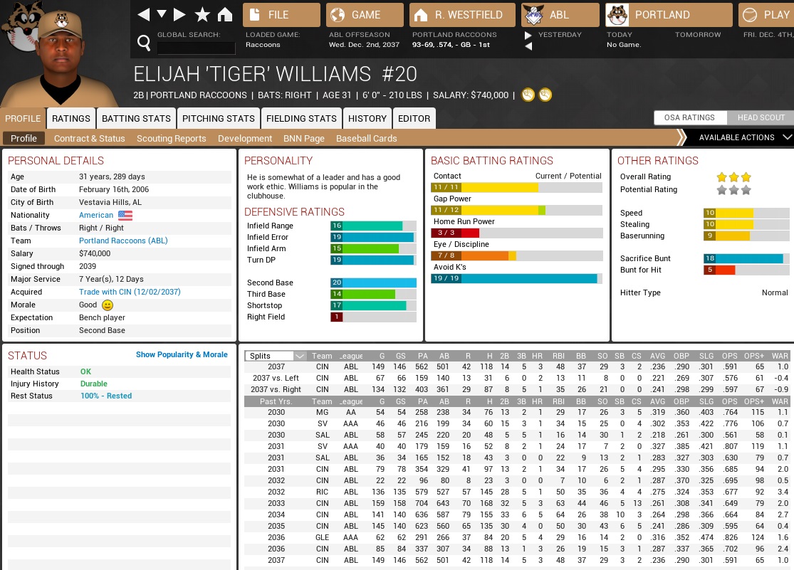 +++ December 2 – The Raccoons acquire 31-yr old INF Elijah Williams (.261, 17 HR, 393 RBI) from the Cyclones for a package of three pitchers: 30-yr old SP Colt Willes (58-53, 3.63 ERA), 27-yr old AAA SP/MR Bob Thomson (1-2, 4.61 ERA), and 23-yr old AAA SP/MR Tyler Canfield (0-0, 7.20 ERA), plus $1M in cash. +++ The Cyclones were rebuilding – they had the time and patience to see whether there was anything left to Colt Willes, and would pay roughly one third of his salary for 2038, with the Raccoons packing the rest, but at least we had cleared that roster spot. Thomson was probably never going to amount to more than long relief, but he was a groundballer and the Raccoons’ defense hadn’t been the best in recent years, *and* there was the problem of small sample size. Canfield had only made a handful of relief outings. The Cyclones were high on him; we weren’t. Williams, a former #12 pick, was a top-notch defensive infielder with a defensive shortstop’s bat. That was alright – he was going to be paid like a defensive shortstop for the next two seasons! He was also a team leader personality and got along well with everybody. I wondered whether he’d also get along well with me. Say, Berto, that guy is just as old as you are, and yet he is a so much better defender! How come you can’t range to your right and left anymore? – (Berto burps, then reaches for another turkey drum, with one paw firmly stuck in a bowl of mashed potatoes) This added another bat to the infield tussle. Williams was right-handed so would obviously at least platoon with Berto as well as play late-inning defensive replacement for him, but he could also spot Cosmo and Myers a day off. This would work well as long as you didn’t expect any offensive heroics from him. He had NEVER made it to being even a league-average batter; his best ever OPS+ in a season had been 96, in 2036, but he had missed plenty of time there. In a qualifying season his best was a 93 (’32), and for his career he was an 80 OPS+ batter. But he brought two Gold Gloves to a team that didn’t have many of them, and he brought the right mindset (bench job) and attitude (team first, him second). Big W, this deal! Add in that we a) got rid of Willes and b) avoided parting with Nelson Moreno, our best pitching prospect in a while, who’s popular with ALL teams, and this was already shaping up to be the biggest coup since the Blue Sox fleeced us for all of Dennis Fried’s Hall of Fame career for three games of Raúl Castillo. Vickers was still hanging on to that second bench job. There was however no point in keeping some of the other players around any longer. Everybody with no chance to make the Opening Day roster was reassigned at this point, which included reliever Francisco Pena, catcher Matt Hartley, and then a multitude of infielders: Jose Brito, Jon Caskey, and Steve Nickas. The only infielder that we wanted no part of that was not reassigned was Chiyosaku Maruyama, who was out of options. +++ December 3 – The Stars sign ex-CHA C Ernesto Huichapa (.286, 149 HR, 566 RBI) to a 2-yr, $7.08M contract. December 4 – Salem sends SP Jose Alaniz (24-17, 3.44 ERA) to the Miners for 1B Bill Jenkins (.297, 2 HR, 15 RBI). December 5 – The Stars blow more money on another catcher, signing former Gold Sox backstop Danny Zarate (.263, 152 HR, 784 RBI) to a 2-yr, $4.4M contract. December 5 – A trade wit hthe Gold Sox sees the Stars pick up 27-yr old OF Sean Calais (.292, 14 HR, 121 RBI) for two prospects. December 6 – Ex-WAS 2B/SS Keith Spataro (.287, 66 HR, 667 RBI) signs a 3-yr, $8.72M contract with the Buffaloes, which is a bold move for a team with a 36-year-old middle infielder. December 6 – Former Miners SP Matt Moon (61-63, 3.50 ERA) returns to the Falcons via free agency, signing a 3-yr, $4.26M contract. December 10 – The Crusaders pick up Richmond’s SP Jamal Barrow (19-28, 4.49 ERA) for two prospects. December 10 – More pitching in Dallas, with the acquisition of SP Antonio Vega (30-22, 4.10 ERA) from the Aces, who receive a prospect. December 11 – The Stars also get outfielder Will Korecky (.232, 36 HR, 184 RBI) from the Canadiens, plus a prospect, in exchange for SP/MR Alexander Lewis (16-29, 4.10 ERA, 7 SV). December 11 – Another pitcher goes to New York, with SP Joe Feltman (27-29, 4.47 ERA) being acquired from the Scorpions for two prospects, including #56 SP Craig Czyszczon. December 11 – The Bayhawks part with SP Ben Lipsky (118-100, 3.53 ERA), who is dealt to the Cyclones for RF Bobby Hennessy (.247, 11 HR, 56 RBI) and a prospect. December 12 – The Aces reunite with ex-SAL 3B Chad Armfield (.286, 49 HR, 405 RBI) for 2-yr, $2.64M. December 12 – The Indians get a new reliever in Michael Donovan (16-9, 3.38 ERA, 6 SV) and cash for a prospect. December 12 – New York acquires 2B Mario Duenez (.262, 45 HR, 349 RBI) and cash for MR Michael Zabek (5-5, 4.55 ERA) and #22 prospect CL John Steuer, who was drafted two years ago and traded three times now. December 12 – The Loggers send 1B Salvador Ayala (.263, 19 HR, 137 RBI) to the Buffaloes for #52 prospect INF Quadir Randle. December 14 – The Rebels pick up 33-yr old 2B/SS Alex Majano (.308, 29 HR, 657 RBI) from the Cyclones, along with a prospect, parting instead with 28-yr old 2B/3B Ben “Nine Fingers” Freeman (.279, 84 HR, 437 RBI). December 17 – Former Indians outfielder Oscar Mendoza (.262, 97 HR, 499 RBI) ends up with the Warriors for 2-yr, $2.44M. +++ Former Raccoons finding a new home: only Preston Pinkerton, who signed with Sioux Falls for $288k; And there’s another Hall of Fame ballot out!