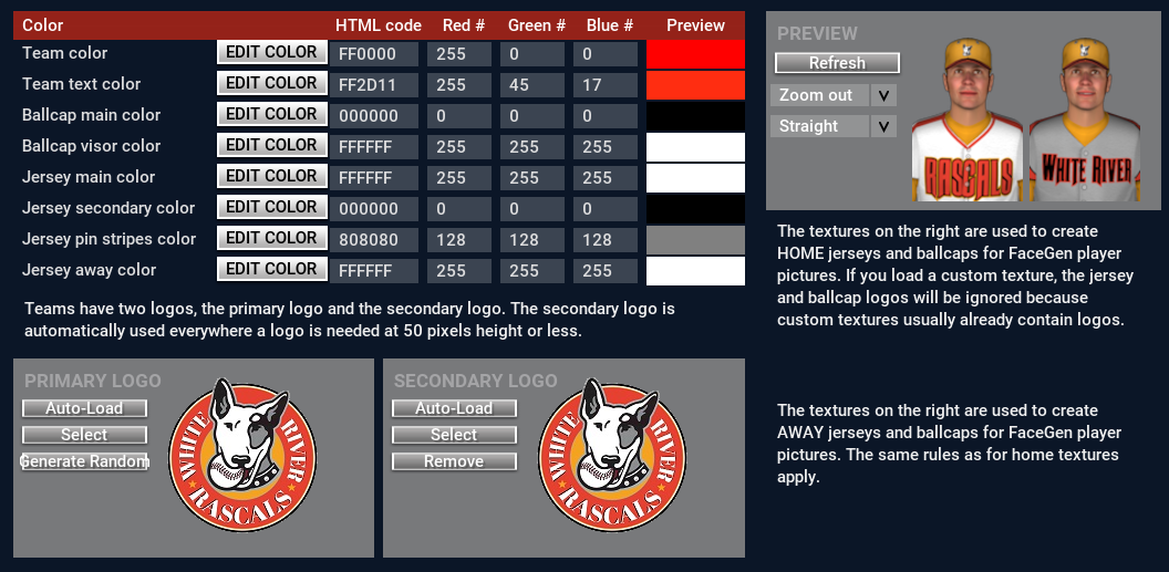 White River Rascals Colors:Mainly Orange and Red with some Black, Gray and White for the Racal Image. The first logo is the current one in use... use it for the colors. The second one is a logo for the River City Rascals... just to give you another sample image... don't know if you can alter either dog image or not. The third one is the dog image I edited from the current logo... don't know if you can use it or not... it is not very clean at the edges. Just do your own thing... try to use my colors. Please make the logos 150 x 150 pixels. And go light on the jersey shading... dark shading does not show up well on game screens in my opinion... I like good contrast on logos, jerseys and caps. Hope you don't mind me being picky. Screenshots are for suggested colors and mascot images... get your own mascot images if you prefer... and use your own colors if you prefer. Last edited by Eugene Church; 09-02-2020 at 12:35 PM. |