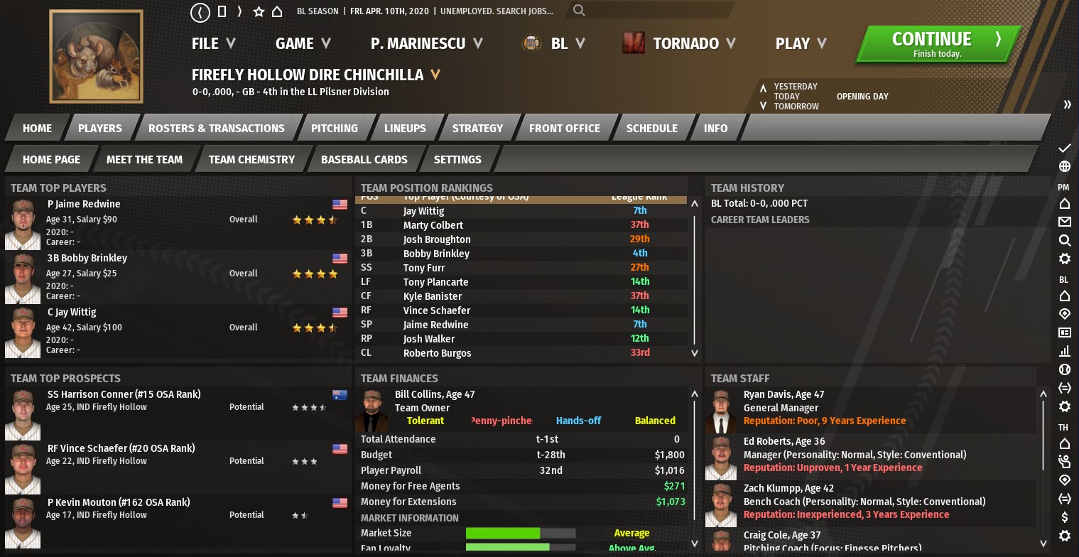 Firefly Hollow Dire Chinchilla C - Jay Wittig (1st round - 39th overall) 1B- Marty Colbert (16th round - 602nd overall) 2B- Josh Broughton (11th round - 439th overall) 3B- Bobby Brinkley (2nd round - 42nd overall) SS- Tony Furr (9th round - 359th overall) LF- Tony Plancarte (12th round - 442nd overall) CF- Kyle Banister (17th round - 679th overall) RF- Vince Schaefer (6th round - 202nd overall) top SP - Jaime Redwine (3rd round - 119th overall) top RP - Josh Walker (14th round - 522nd overall) CL - Roberto Burgos (13th round - 519th overall) top prospect - SS-Harrison Conner (4th round - 122nd overall) |