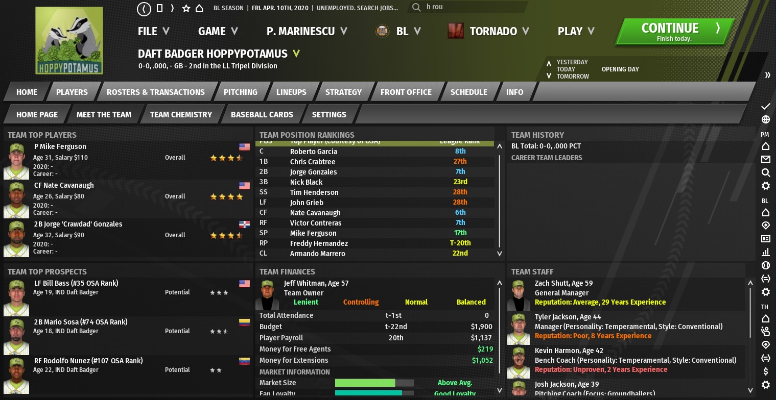 Daft Badger Hoppypotamus C - Roberto Garcia (3rd round - 114th overall) 1B- Chris Crabtree (19th round - 754th overall) 2B- Jorge Gonzalez (5th round - 194th overall) 3B- Nick Black (10th round - 367th overall) SS- Tim Henderson (7th round - 274th overall) LF- John Grieb (16th round - 607th overall) CF- Nate Cavanaugh (2nd round - 47th overall) RF- Victor Contreras (4th round - 127th overall) top SP - Mike Ferguson (1st round - 34th overall) top RP - Freddie Hernandez (17th round - 674th overall) CL - Armando Marrero (9th round - 354th overall) top prospect - LF-Bill Bass (23rd round - 914th overall) |