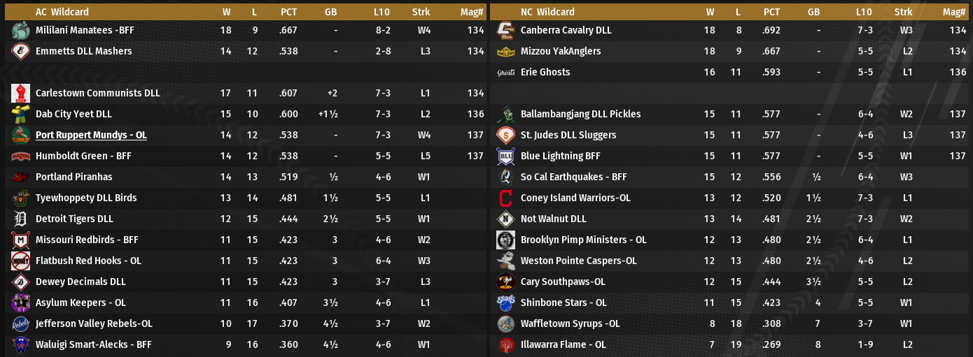 Only Ring Road in B322 and Asylum in S270 are still around. Both teams are trailing 0-2 in their respective world series. I'll check back once more in about an hour or so before tying a bow on 2054. Sure hope iron 265 doesn't give us our first season without standings.