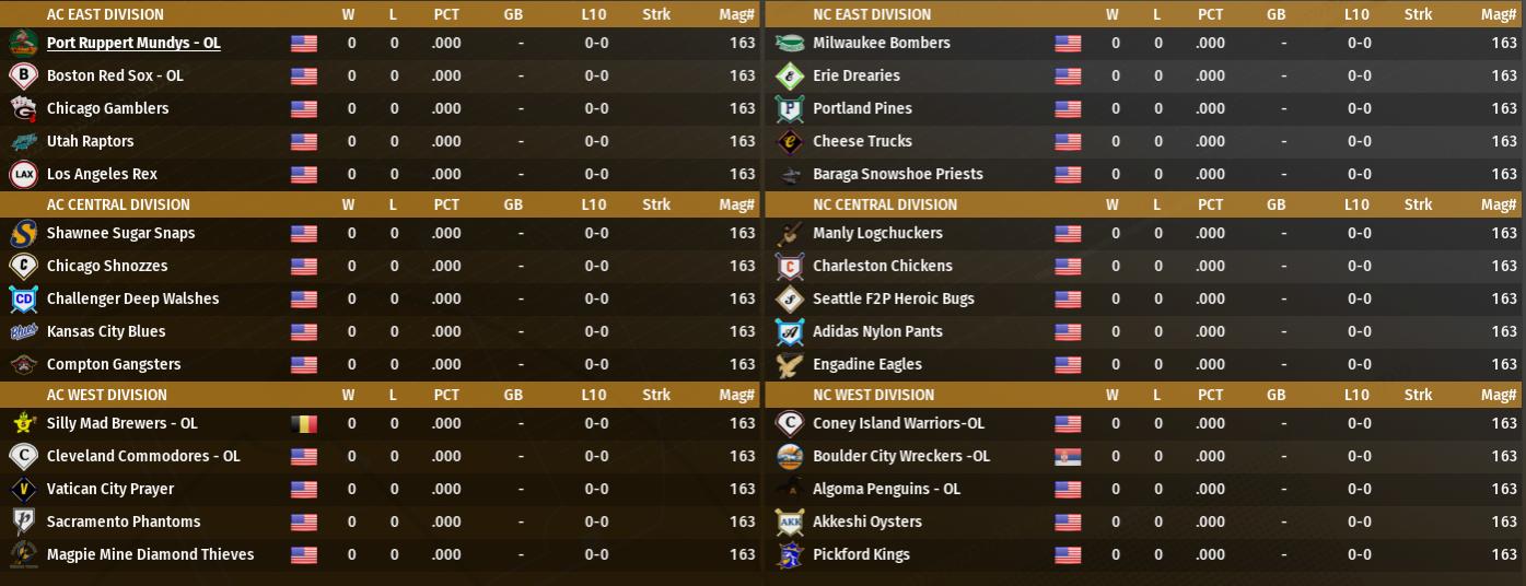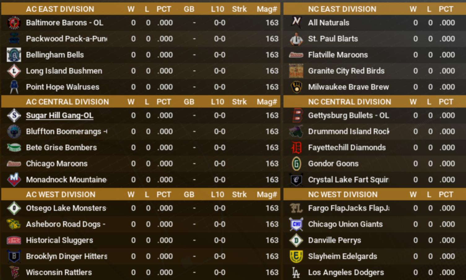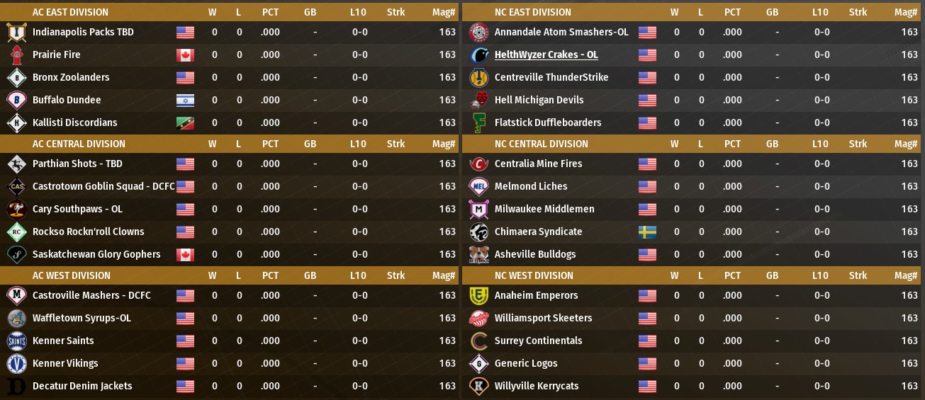 There are 4 OL teams in Gold--2 in each conference. Waffletown Syrups and Cary Southpaws are in the AC but only play each other 7 times. Annandale Atom Smashers and Helthwyzer Crakes are in the NC and play each other 19 times (I hope Crakes win a few!).