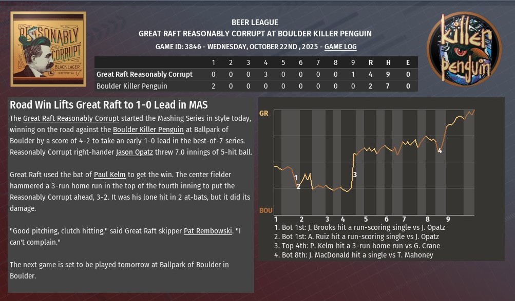Clinging to a 2-1 lead heading into the bottom of the 7th, Ballast Point looked to get just 9 more outs and avoid an early upset exit from the post season. Great Raft had other plans and pushed across three runs in the bottom half of the frame, thanks to an RBI double from Adrian Shaw and a 2 run homer from Carlos Garcia. The Reasonably Corrupt tacked on another run in the 8th and finished off Ballast Point 5-3 in the game, and 3 games to 1 in the series. |