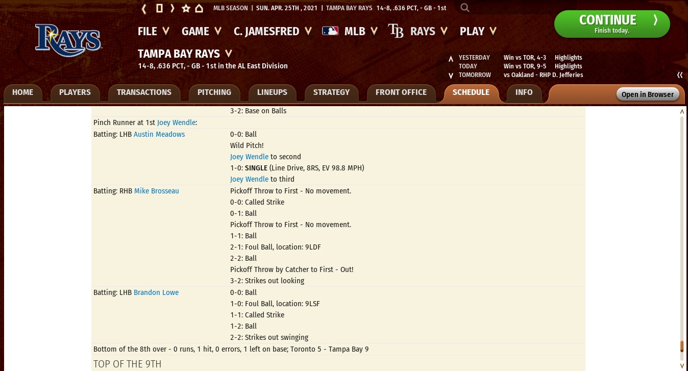1. My sliders are fine. One notch above the medium. Which is probably too low given how many really good base runners/stealers Tampa Bay has. 2. I play all the games out pitch by pitch so I am the one managing the situations. As mentioned, not once has there been any intention to run when these pick offs occurred. 3. I have hired a really excellent coaching staff. My first base coach is outstanding at teaching various elements of the game and that is why I hired him. With all due respect to OOTP devs, if a 'decent' first base coach is somehow responsible for this ineptitude of historical proportions, then it is they who need to re-visit their settings and the impact of coaches on the outcomes. Especially the outcomes of 'there is no play on here' situations. Last edited by Dave Stieb II; 06-16-2021 at 07:57 AM. |