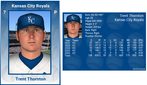 The Shreveport Sting announced today that reliever Aaron Fultz will retire at the end of the season at 36 years old Fultz has appeared in 328 career games mostly with the Kansas City Royals from 2019-2023. Fultz has appeared in two games so far this year for Shreveport. He is happy to finish his career in the south instead of Rome, Italy where he played last season Retirement news out of Maui, as pitcher RA Dickey will call it a career this year for the Maui Lobos. Dickey is 36 years old and feels that his knuckles are worn out. Dickey has a 21-68 career record and because of expansion has lengthened his career. He has played for a lot of teams, but most notably the Albuquerque Blackbirds from 2021-2023. He has not even thrown a single pitch in Maui yet but said this is the end. The Athens Odyssey are in their first season and they have already lost a player for the season. Rookie reliever and 9th round pick Brian Eversgerd is out for 5 months with a torn back muscle. He suffered the injury in a hard fought 2-1 extra inning loss to the Seattle Mariners on the road. It was bittersweet for Eversgerd as he was so excited to start his big league career with a team from Greece playing in Seattle, not too far where he grew up in Centralia. Trent Thornton won 19 games in 2025 for the Kansas City Royals but his 2026 season has already ended. He damaged his elbow ligaments on the road in an 11-3 beating by the Branson Jackals. Thornton lasted one inning and 16 pitches before complaining of pain. Royals will promote Lowell Palmer to take his spot in the rotation which is not comforting for Kansas City fans. In other injury news, the New York Mets have lost the service of 3B Bill Joyce for 7 weeks with a fractured ulna. Joyce is a solid bat in the Mets lineup with 90 homers over the past 3 seasons. Injury was in a dramatic game at Citifield against the Los Angeles Dodgers where Danny Coombs hit Joyce with the pitch with the game tied at 3-3, so probably not intentional. Next batter up is the man of dramatics, Bobby Thomson and he hits a walk off 3 run homer off Coombs to give the Mets the walkoff win. It appears Jared Sandberg will play 3rd base with Joyce out. |