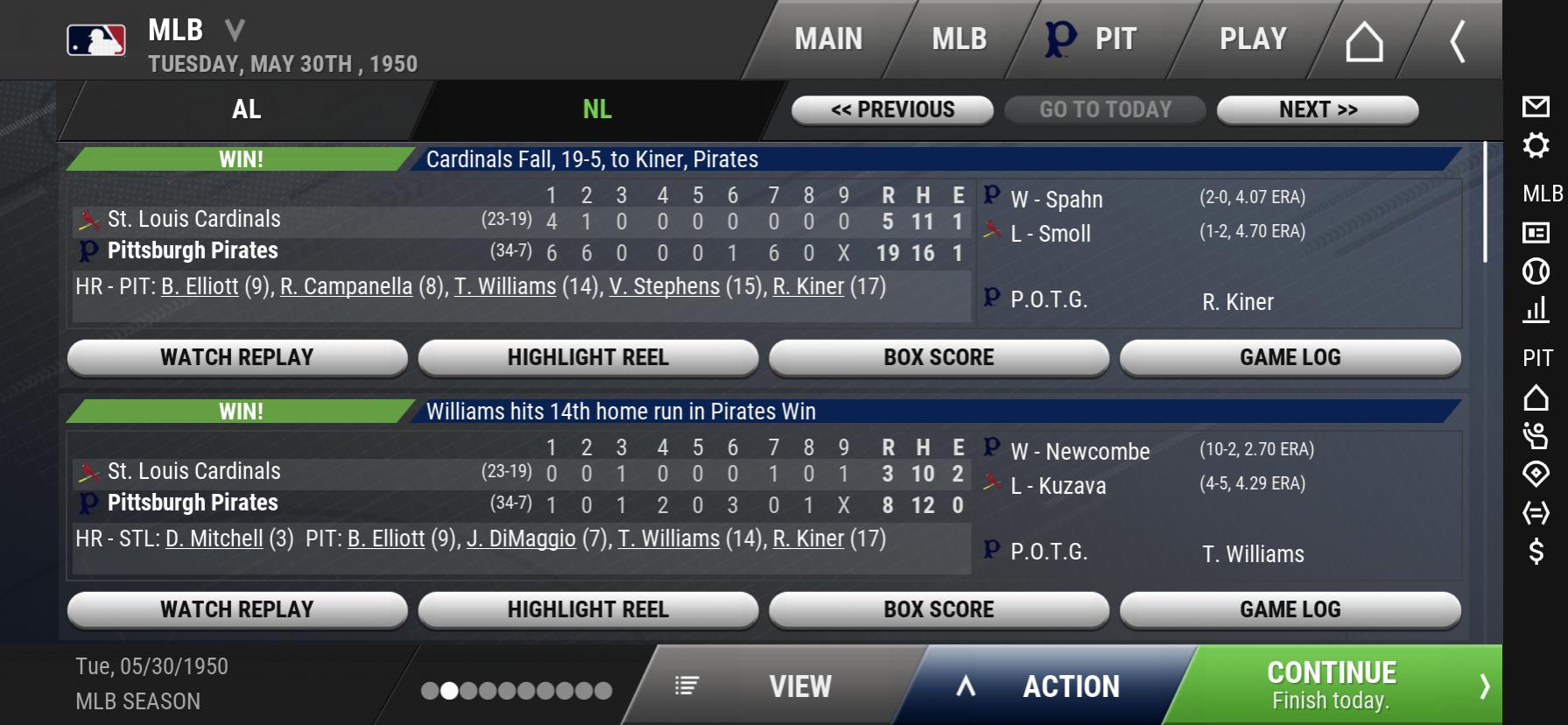 Option for "Continue" to go back: No matter how long I've played the game, I sometimes make the mistake of hitting "Continue" when I was looking at players or something, and of course it tries to start a game. I never, ever want to jump from "research" to "play game" and would like some other option for Continue. I think the problem is that the Continue button tends to be in my field of vision while I have to look up for the Back arrow. I never want Continue to launch a game -- I invariably launch games from the manager screen with the "Play Ball" button. In fact, why have a button with the ambiguous label of Continue? Make it say "Play Ball" or "Swing Away" or "Pitch" or whatever. Can't recall any other program in 35 years of using PCs/tablets that had such a poorly labeled control.