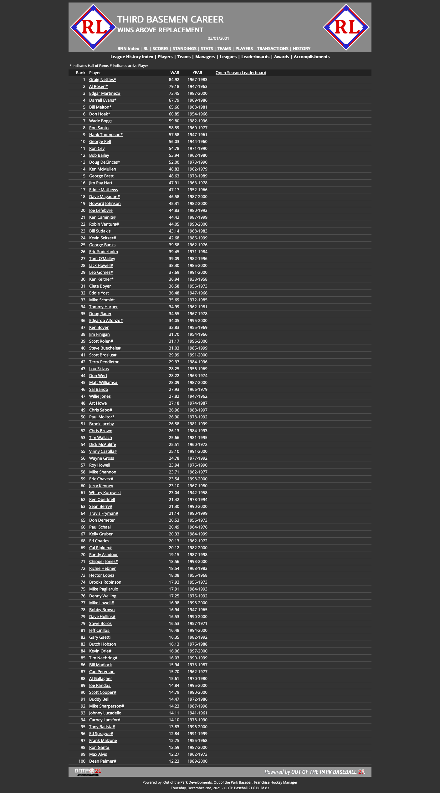 Otherwise I think this list is pretty much what you might expect. Keith Miller is a bit weird, since I think he played more middle infield in real life (though I could be getting confused, since I think there were two simultaneous Keith Millers) but he was definitely an excellent defender in RL, without too much else to offer. Coming soon: I will track down the single season leaderboards to share. |