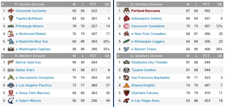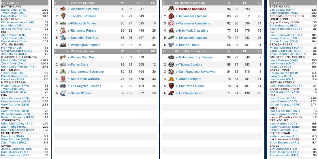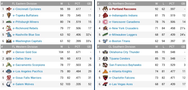 Seven games out in the South, the Knights had only hypothetical playoff chances anymore. They ranked fourth in offense in the CL, but had conceded the third-most runs, which had allowed some of the wheels to come off. Both starters and rotation were in the bottom four by ERA, and their defense was even the worst in the CL. They also had a number of pitching injuries, including starters David Farris and Brian Buttress. Regardless, the Raccoons had not played Atlanta well this year, and trailed in the season series, 4-2. Projected matchups: Sadaharu Okuda (9-10, 3.99 ERA) vs. Blake Sansone (6-6, 3.77 ERA) Jake Jackson (12-12, 3.71 ERA) vs. Brad Santry (6-1, 1.83 ERA) Jeremy Chaney (0-0) vs. Kurt Olson (10-12, 5.18 ERA) The opposition was exclusively right-handed here. Meanwhile, the Wednesday start would have been Merino’s, but the Raccoons brought up a sixth starter (needed anyway next week) in Jeremy Chaney, who had gone 9-10 with a 4.01 ERA in AAA. The 25-year-old groundballer had been brought over from the Capitals the prior fall and had appeared in relief 27 times for the Caps. Chaney would get three starts in these last two weeks, maybe including the season finale. Game 1 ATL: CF Alade – 1B Delagrange – RF Marz – LF Hester – 3B Crim – C Cass – SS J. Gonzalez – 2B Sprague – P Sansone POR: RF Mercado – CF Herrera – 3B Maldonado – 1B Toohey – C Morales – SS Waters – LF Fernandez – 2B Martell – P Okuda The Knights opened with three straight singles against Okuda. John Marz drove in Jon Alade, while Billy Hester’s sac fly brought in Chris Delagrange, too. While Manny Fernandez singled home Tony Morales in the bottom 2nd to reduce the gap to 2-1, the 1-2 batters were on base again to begin the top 3rd, now with a single and a walk. Marz flew out, but Hester singled to left. Manny threw out Alade at home plate, and Joe Crim grounded out to keep the Knights off the board for that inning. The Raccoons got their scoring opportunity in the bottom 3rd late, with two outs. Sansone walked Armando Herrera, nicked the nicked-often Maldonado, and then conceded the tying run on a 3-2 RBI single by Bryce Toohey. Tony Morales flew out to Hester, keeping the game tied. However, the Knights’ 1-2 batters kept tearing up Okuda. Alade hit his third single of the game in the fifth inning, just in time for a Delagrange homer to give them a 4-2 lead. Okuda was done after six, while the Raccoons stirred in the bottom 6th. Maldo singled to open the inning, and while Toohey flew out, Morales and Waters hit singles to move him around, 4-3, with two aboard for Manny, who rolled into a double play instead… The team instead tied the game in the seventh with Herrera’s 2-out RBI double, chasing home Derek Baskins from second base. Maldo flew to deep right afterwards, but couldn’t beat the range of John Marz. But the lead was taken in time with a leadoff jack smashed by Bryce Toohey in the bottom 8th, his 30th homer of the season. The Raccoons found a way to load the bases against Mario Benavidez through Matt Waters walking, plus singles from Gene Pellicano and Ruben Gonzalez after that, and Pat Gurney hit a pinch-hit 2-run double to provide some cushion before Bob Ibold took the ball for the ninth inning – neither Rella nor Lynn were available, and Moreno had pitched a scoreless eighth before being pinch-hit for. Jorge Gonzalez and Glenn Sprague promptly assaulted Ibold with singles to begin the ninth. Ibold rung up Manichiro Toki, but Alade hit another single to left. The Knights were too greedy, though, and Gonzalez was sent around. Bryce Toohey had ended up in leftfield by then and became the second Critter in the game to notch an assist from position #7. Delagrange flew out to Herrera to end the game. 7-4 Raccoons. Gurney (PH) 1-1, 2B, 2 RBI; Toohey 2-4, HR, 2 RBI; Morales 2-4; Pellicano (PH) 1-1; Baskins (PH) 1-1; Gonzalez (PH) 1-1; The Indians lost a 10-inning squeezer to the Thunder, 1-0, increasing the Raccoons’ lead to nine games. The magic number was five. Game 2 ATL: SS J. Gonzalez – 1B Delagrange – RF Marz – LF Hester – 3B Crim – 2B Sprague – CF Price – C Toki – P Santry POR: RF Mercado – CF Herrera – 1B Gurney – 3B Maldonado – C Morales – SS Waters – LF Baskins – 2B Martell – P Jackson The middle game was scoreless through five, with precious little going on. Jackson allowed one hit against five strikeouts and didn’t bother his defense too much, while the Raccoons had two Gurney singles and really not a whole lot more than that. Jackson removed the 9-1-2 batters with two strikeouts in the top 6th then, after which the Raccoons loaded the bases with nobody out. Herrera was nicked by Santry, Gurney singled, both pulled off a double steal, and Maldonado was walked with intent immediately afterwards. As the next three Critters in line made a predictably poor string of three outs, the only run in the inning scored on a wild pitch by Santry… That was all the runs any team could muster through eight innings. Jackson had a 2-hitter with 9 strikeouts going, but with the top of the order back up in the ninth, the Raccoons went to Josh Rella with the 1-0 lead, despite probably being able to know better. He hit Gonzalez right away to put the tying run on base. Delagrange bunted the runner to second, but Marz then grounded out to Maldonado and Hester grounded out to Martell to end the game anyway. 1-0 Blighters. Gurney 3-4; Jackson 8.0 IP, 2 H, 0 R, 0 BB, 9 K, W (13-12); While this W mathematically eliminated the damn Elks, the Indians blew a 5-0 lead against the Thunder and took a 7-5 loss instead. The gap was 10 games, and the magic number was three. Game 3 ATL: SS J. Gonzalez – 1B Delagrange – RF Marz – 3B Crim – CF Alade – 2B Sprague – LF E. Hernandez – C Toki – P K. Olson POR: LF Baskins – CF Herrera – 3B Maldonado – 1B Toohey – SS Waters – C R. Gonzalez – RF Pellicano – 2B Martell – P Chaney Chaney g