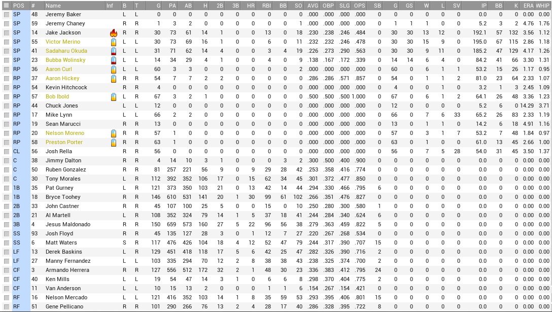Meanwhile in the FL there were two 100-win teams opposing each other, and there could only be one that would progress to the World Series. The 100-62 Cyclones had won their division by 11, scoring the most runs in the league, while conceding the second-fewest with a +186 run differential. They were neither into homers nor stolen bases, instead just hitting away at the opposition with a .280 team batting average. Dan Mathes (.347, 16 HR, 101 RBI), Chris Delgado (.312, 7 HR, 96 RBI), and Chris Strohm (.322, 5 HR, 45 RBI) all hit over .300, an Alvin Zuazo added 22 homers and 117 RBI. The only piece missing (on the DL) would be Jesus Burgos (.300, 7 HR, 91 RBI). Pitching-wise they relied on magic from Carson Jarvinen, Bill McMichael, and Willie Gallardo in the rotation, while the pen was fairly sturdy. They all leaned to the right side, McMichael being the only lefty starter, and most of the lineup was right-handed. Opposing them were the 110-52 Gold Sox, who by now had a reputation for winning the FL West by a mile and then farting in the FLCS and going home. They had scored the third-most runs, but had conceded by far the fewest of any team in the league, with a staggering +277 run differential. They were near the top in almost all hitting and pitching categories one would care for, including the best rotation and the best defense, and they were stealing more than a base per game. Ivan Villa (.308, 27 HR, 92 RBI) was the anchor in that lineup with more .300 hitters in Tim Turner and Ronnie Thompson. Jeremy Hornig, Troy Greenway, and Sandy Castillo all hit 14+ homers. The middle of the lineup was mostly left-handed, while the fringes were right-handed, while ALL their starters were righ-handers, led by Gary Perrone (22-6, 2.51 ERA) and Roberto Pruneda (19-8, 2.78 ERA). This was the Gold Sox’ third postseason in a row and seventh overall. They had won the World Series twice (1985, 2003). The Cyclones were in the FLCS for the fourth time in six years, and the 14th time overall. They also had two titles, taking it all home in 1977 and 2010. The teams had met in the FLCS once, in 2044, when the Cyclones upended the Gold Sox only to get swept by the Raccoons in the World Series. +++ CIN @ DEN … 1-8 … (Gold Sox lead 1-0) … DEN Sandy Castillo 2-3, 2 BB, RBI; DEN Tim Turner 3-3, 2 BB, 4 RBI; CIN @ DEN … 3-4 … (Gold Sox lead 2-0) … CIN Chris Delgado 3-5; DEN Devin Phillips 1-3, BB, HR, 3 RBI; DEN Roberto Pruneda 8.0 IP, 9 H, 3 R, 3 ER, 3 BB, 2 K, W (1-0) and 1-2, BB, 2B; The Cyclones out-hit the Gold Sox 10-3 in this game, and still find a way to lose it. DEN @ CIN … 6-0 … (Gold Sox lead 3-0) … DEN Sandy Castillo 2-3, BB, 2B; DEN Ivan Villa 3-4, 2B, 2 RBI; DEN Devin Phillips 2-4, 2B, 3 RBI; DEN Israel Mendoza 9.0 IP, 3 H, 0 R, 3 BB, 3 K, W (1-0); DEN @ CIN … 5-2 … (Gold Sox sweep 4-0) … DEN Ivan Villa 2-4, 2 HR, 3 RBI; DEN Troy Greenway 2-2, BB, 2 2B; +++ Meanwhile, here’s the Raccoons‘ playoff roster shambles after taking their third straight pennant. This World Series might go quicker than the last one. And in the last one we were swept.
