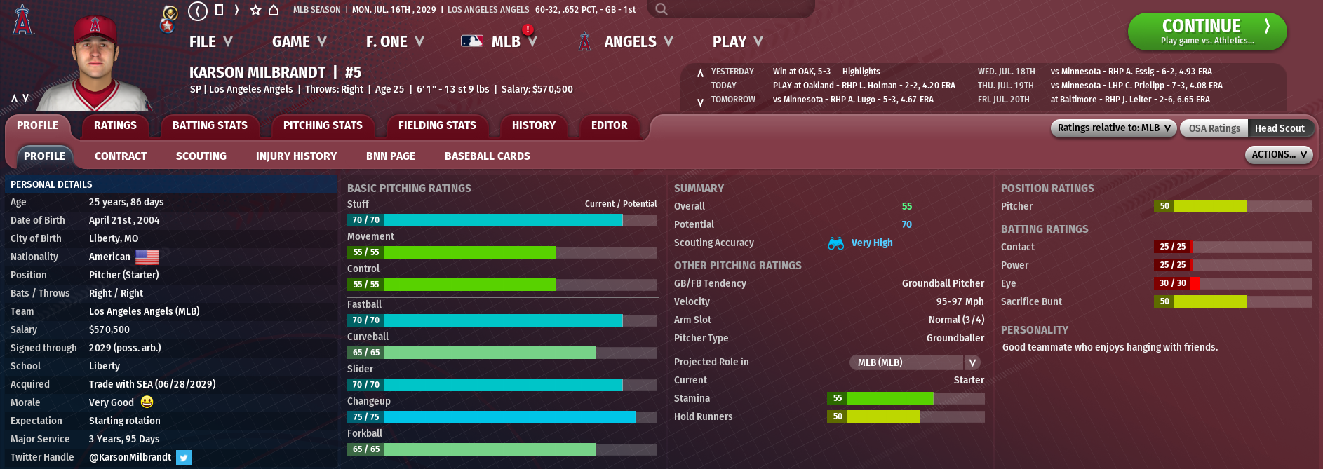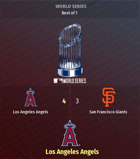 We opened with two comfortable wins, before travelling to Houston, where our bats went quiet. A stressful game 5 then, the series tied at 2 apiece. Karson Mildbrandt pitched for the win, with Wander Franco and Benny Montgomery doing most of the damage with the bats in a 7-4 win. Benny was awarded ALDS MVP. In the ALCS we faced the Yankees, and totally blew them away 14-1 in game 1. They shut us out in game 2, but otherwise we never really looked like losing the series. A 4 games to 2 win, in which Wilman Diaz came to play, and the big fish, Mike Trout got the ALCS MVP. Our first World Series then, and we'd face fellow Californians, the San Francisco Giants. Game 1 was a good 4-2 win, with Milbrandt (currently my most trusted starter) performing well and the bullpen closing it out when things got tight in the 6th. We then proceeded to lose three on the spin. Our pitching was pretty decent throughout, but we got shutout in both game 2 and game 4. We were in big trouble. Game 5 saw the return of Milbrandt, and he got the win against former Angel A.J. Puk. Franco and the previously ice cold Salvador Perez did the damage with the bat in a 4-1 win. The key moment in game 6 came in the bottom of the 6th, with that man Benny Montgomery hitting a base clearing 3 RBI triple to give us the lead. We never looked back, winning 6-1. So to a deciding game 7, where we'd have Shu-de Jen on the mound. He started the year in the bullpen, and ended it pitching 8 shutout innings in the World Series, only giving up 4 hits. Trout, Sims and Diaz hit homers for us, before our closer Eli Kerim pitched the final inning without giving up a thing. A glorious 5-0 win to take the series, with a highly stressful comeback Wander Franco got World Series MVP.![]() My man of the post season is Karson Milbrandt, who made 5 good starts for us, and though he was only credited with 2 wins, the team won all 5 games in which he started. |